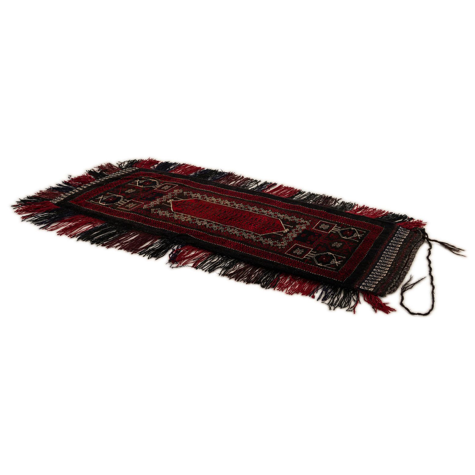 A handmade Balouch 4 Ft Runner rug featuring a traditional Persian tribal pattern in deep reds and black, with decorative fringe.