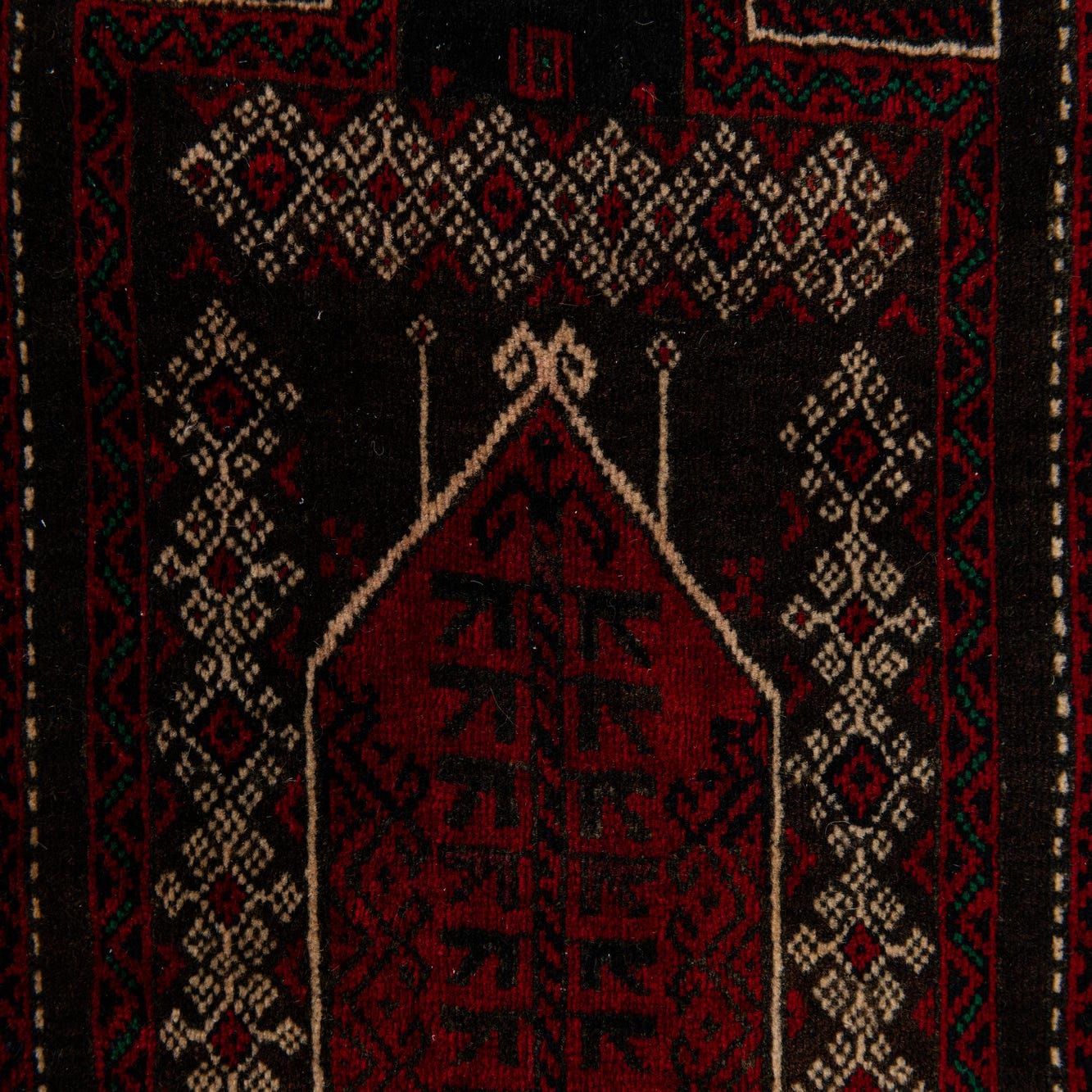 Primary color is Red. Colors in this rug include: Red, Black, Ivory.