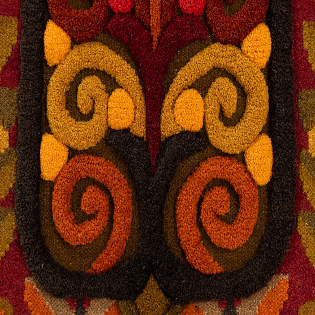 Primary color is Red. Colors in this rug include: Red, Brown, Orange, Yellow, Olive.