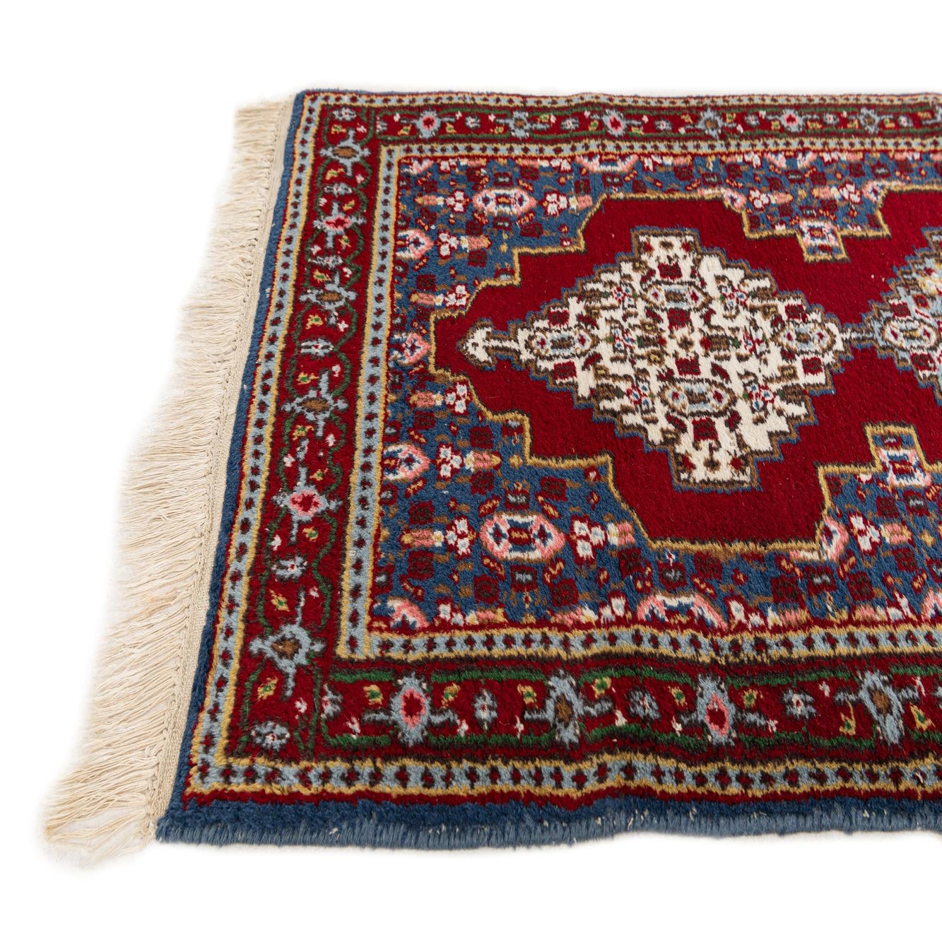 A 4 ft runner rug in traditional tribal style, featuring a deep red field with intricate blue, white, and gold patterns, ideal for hallways.