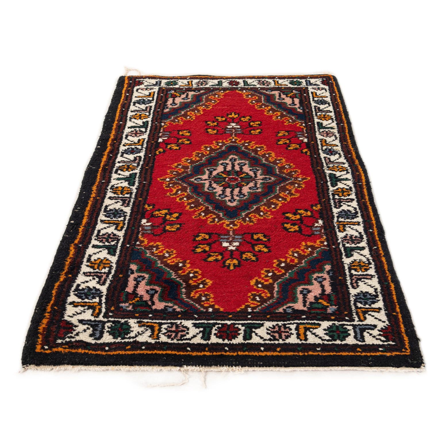 A 4 ft red wool runner rug with a traditional tribal medallion pattern and intricate border.