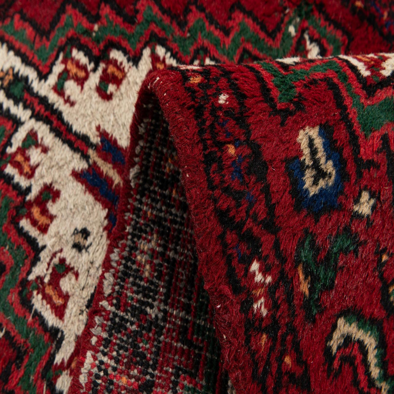 A 4 ft Hamedan runner rug featuring a traditional tribal medallion pattern in rich reds, cream, blue, and green, with fringe.