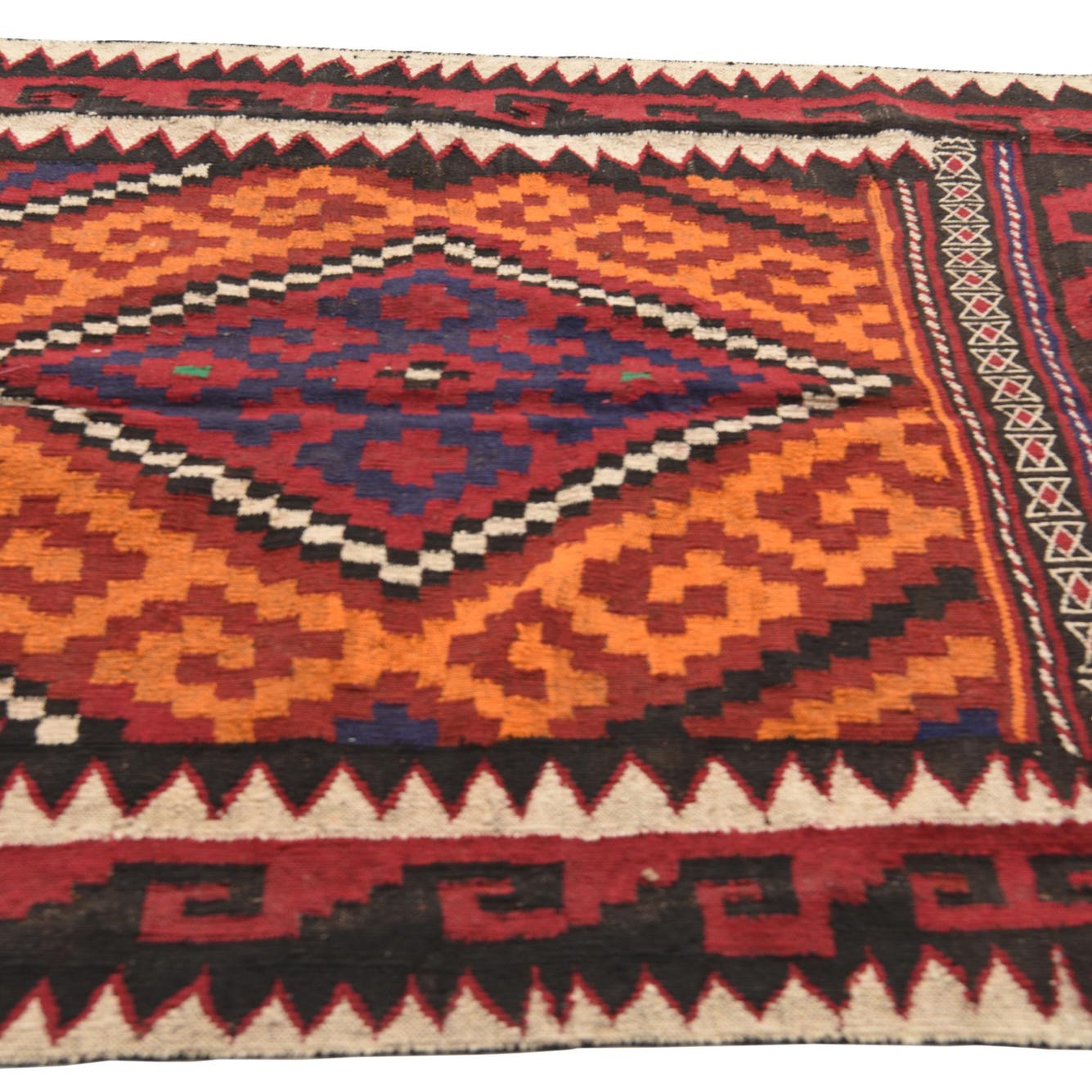 Primary color is Red. Colors in this rug include: Red, Black, Ivory, Navy Blue, Orange, Green, Brown.