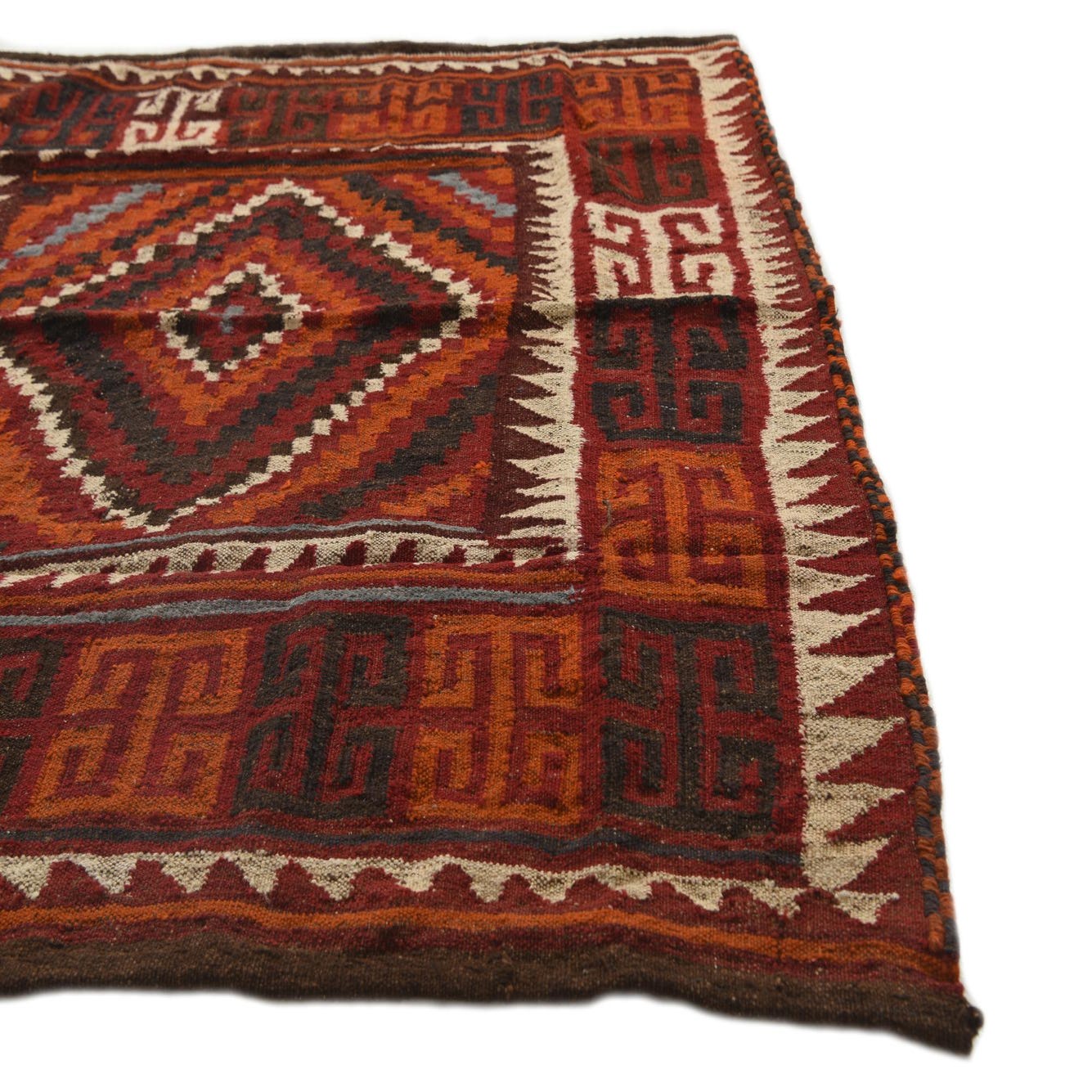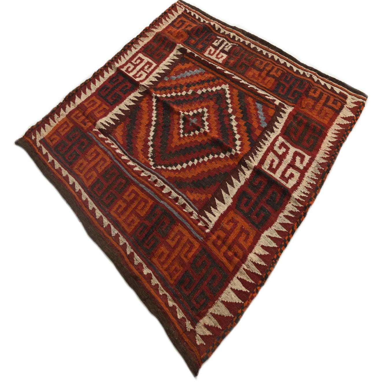 A square 4' 6 x 4' 6 Kilim Fars wool rug featuring a central medallion and tribal patterns in rich reds, oranges, and dark brown.