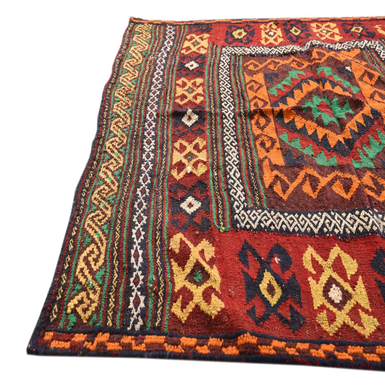 A vibrant 4'x4' red square Kilim Fars rug with a central medallion and tribal patterns in yellow, green, orange, and black.