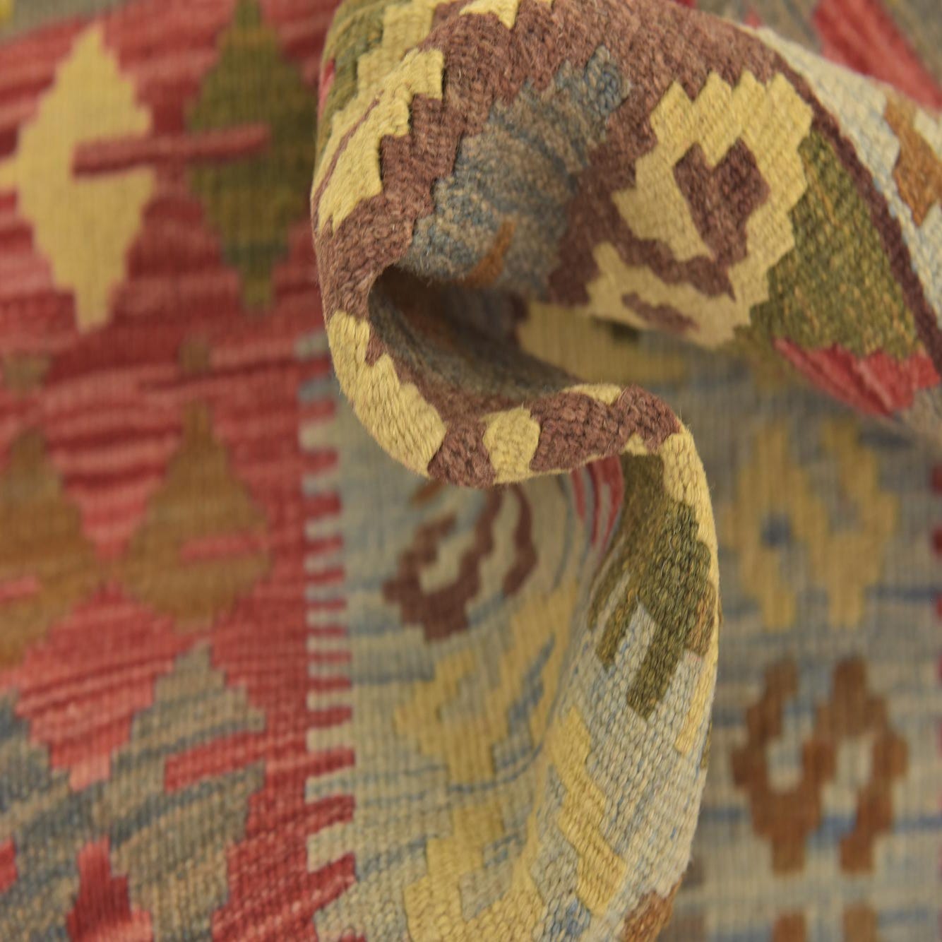 The Kilim Maymana collection presents a 4 Ft Square rug, handwoven from 100% wool, showcasing a traditional flat-weave construction. This piece features a vibrant red background, which serves as a striking canvas for the geometric pattern and intricate motifs. Accents of blue, cream, light blue, green, and burgundy create a harmonious color palette, adding visual depth to the design. The texture is characteristically firm and durable, reflecting the high-quality craftsmanship synonymous with kilim weaving techniques.