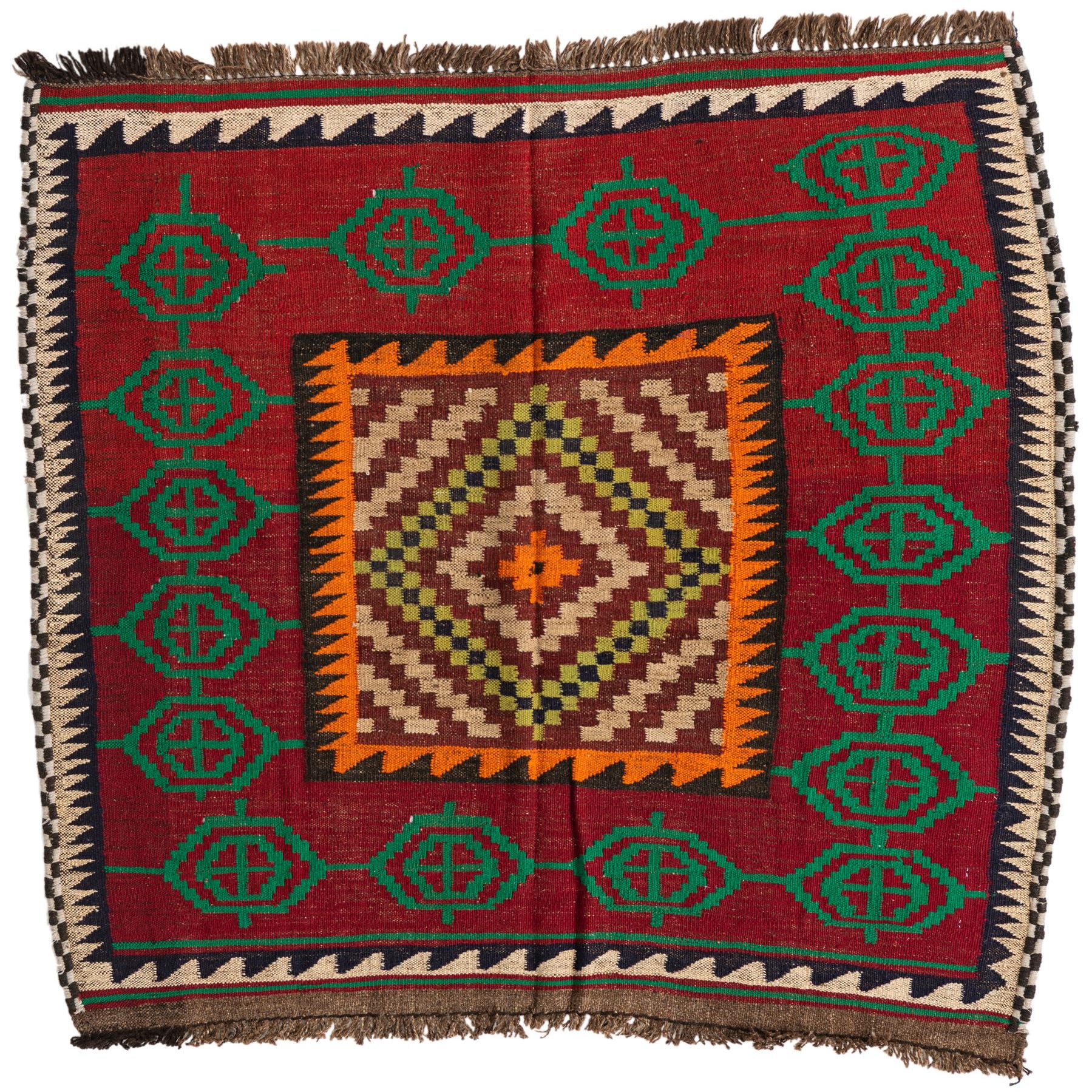 A square 4' 4 x 4' 4 Kilim Maymana rug featuring a vibrant red field with green tribal medallion motifs and a central geometric pattern in orange, brown, and beige.