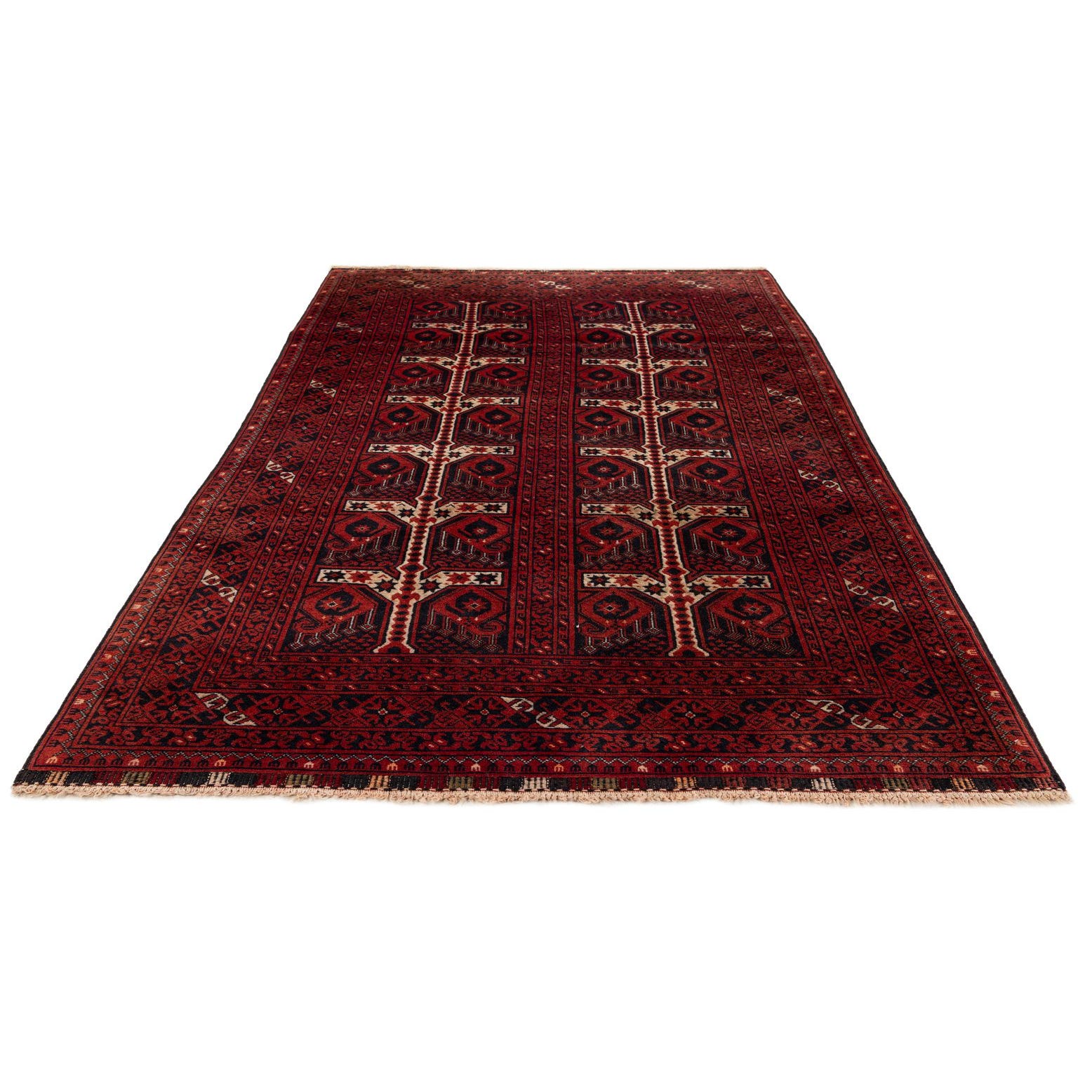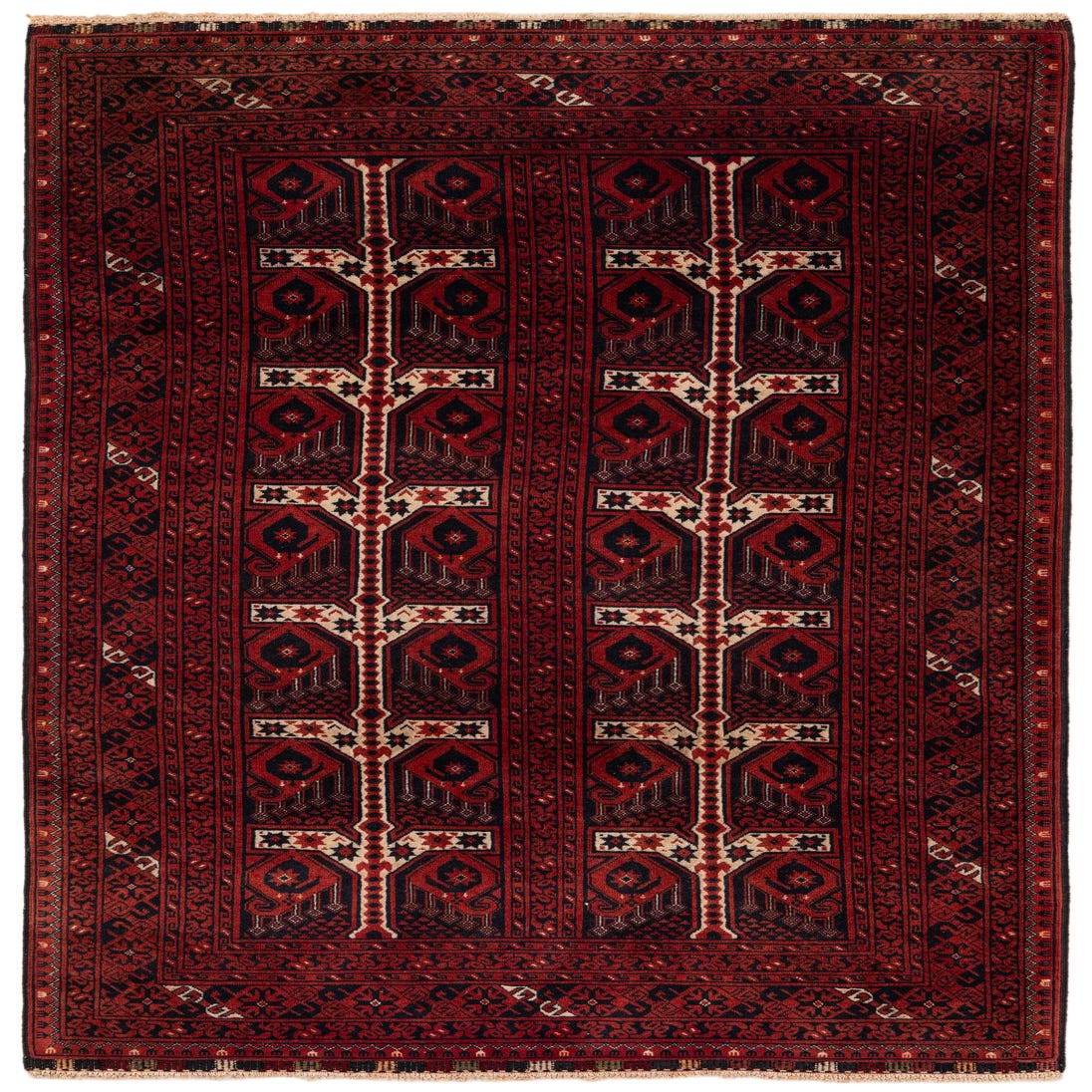 A 4x6 rectangular Afghan Akhche rug featuring a traditional tribal pattern in deep reds, black, and cream, suitable for a living room.
