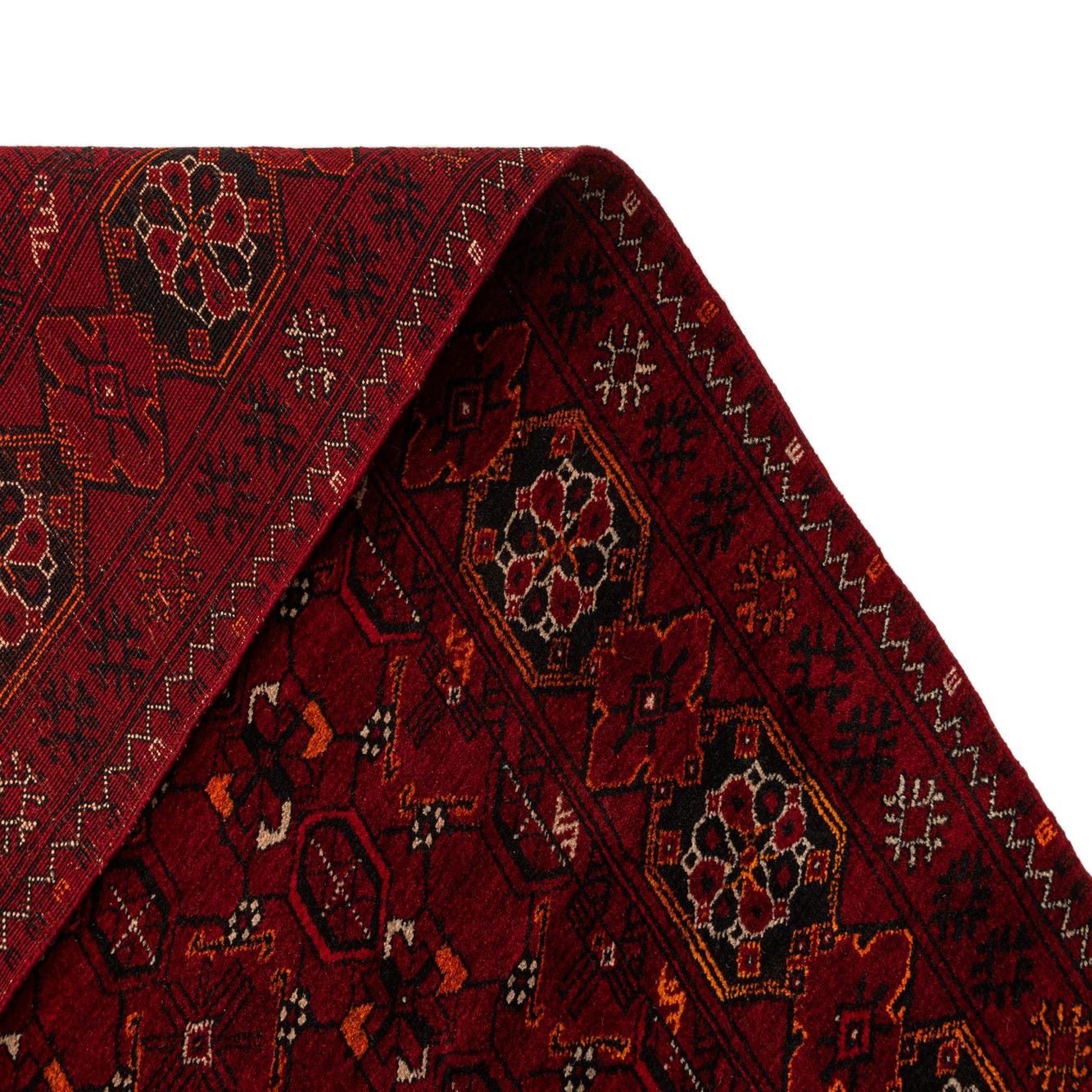 A 4x6 rectangular Afghan Akhche rug in deep red with intricate black, gold, and white tribal patterns and fringed ends.