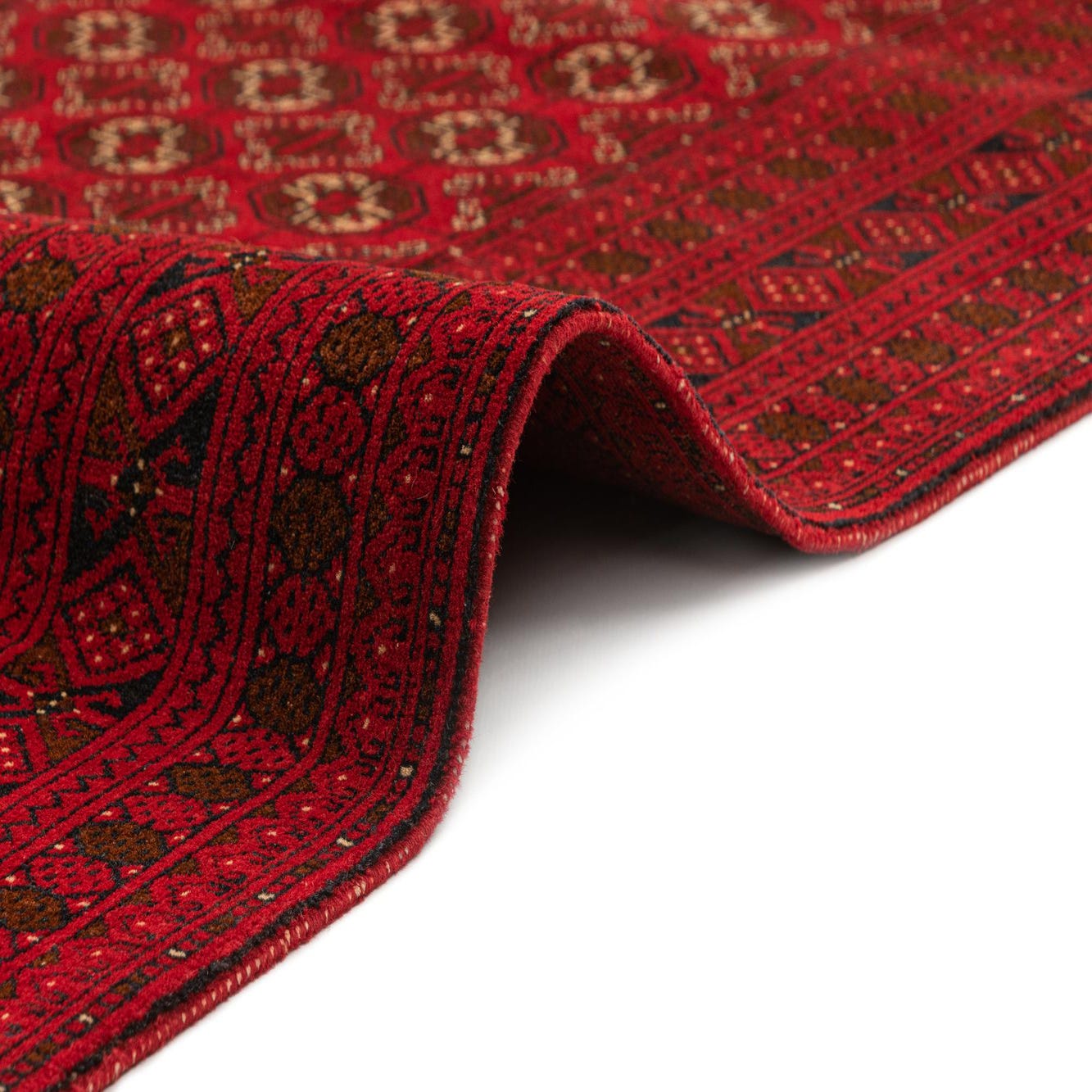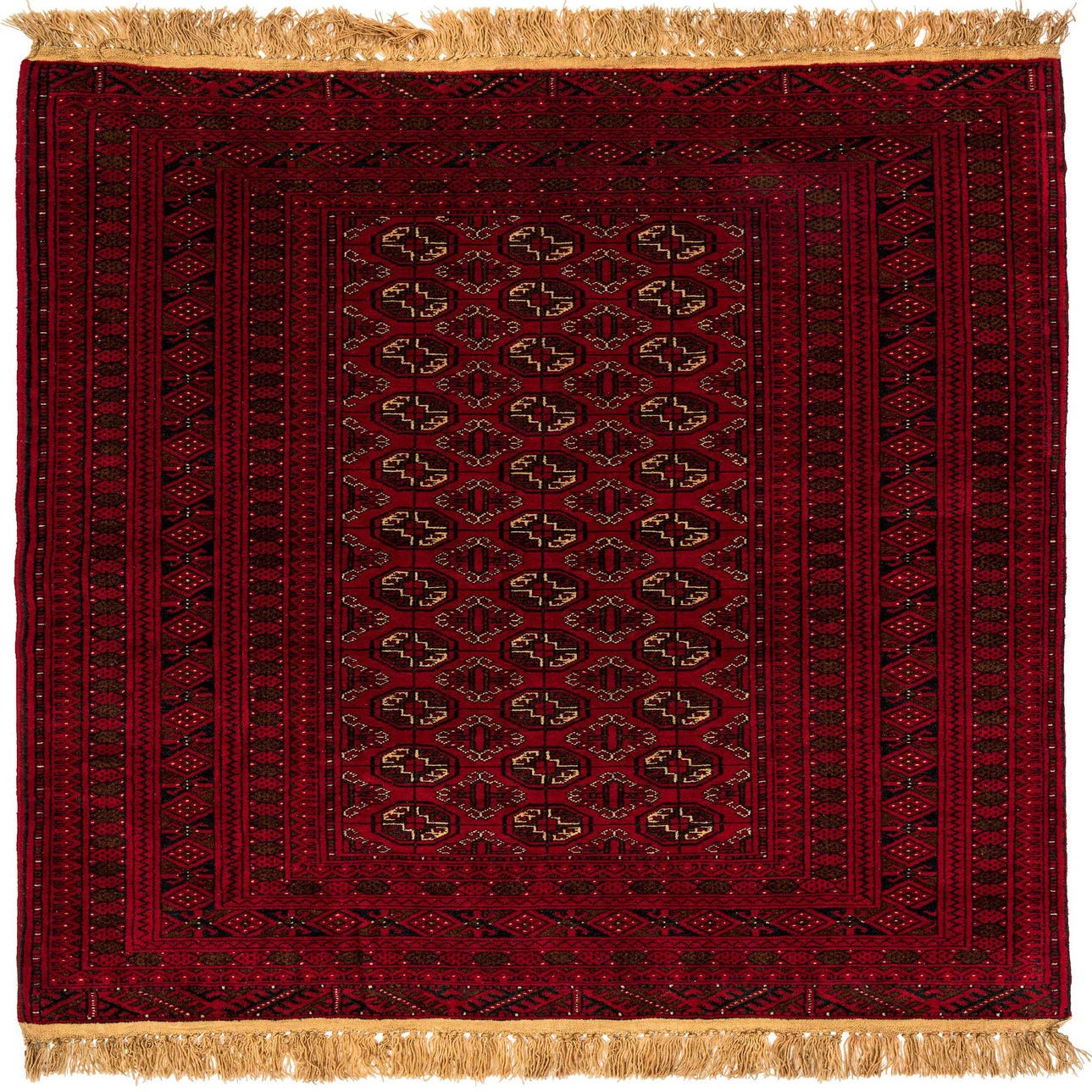 A 4x6 rectangular Afghan Akhche rug in deep reds, featuring a tribal geometric pattern with black and tan accents, and fringed ends.