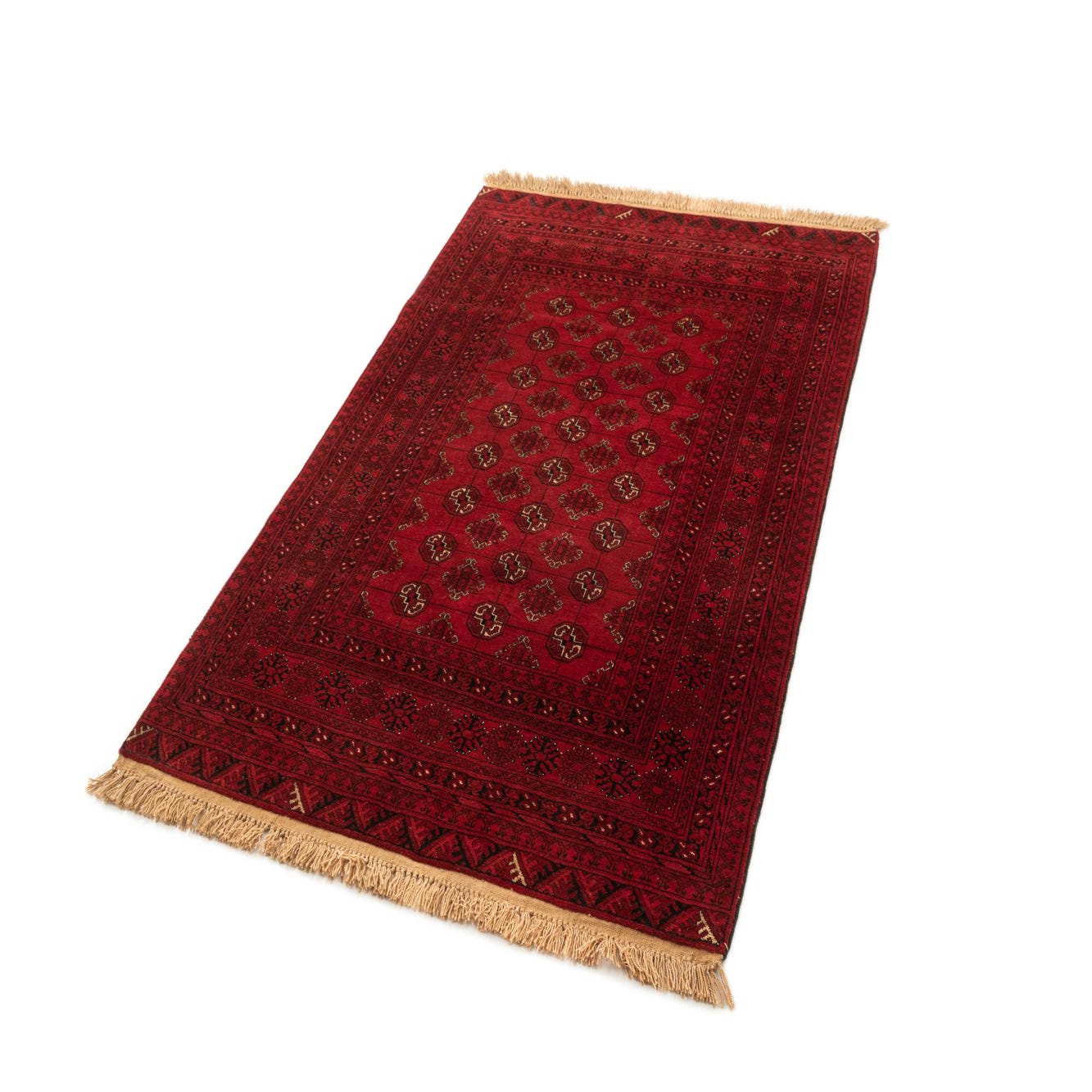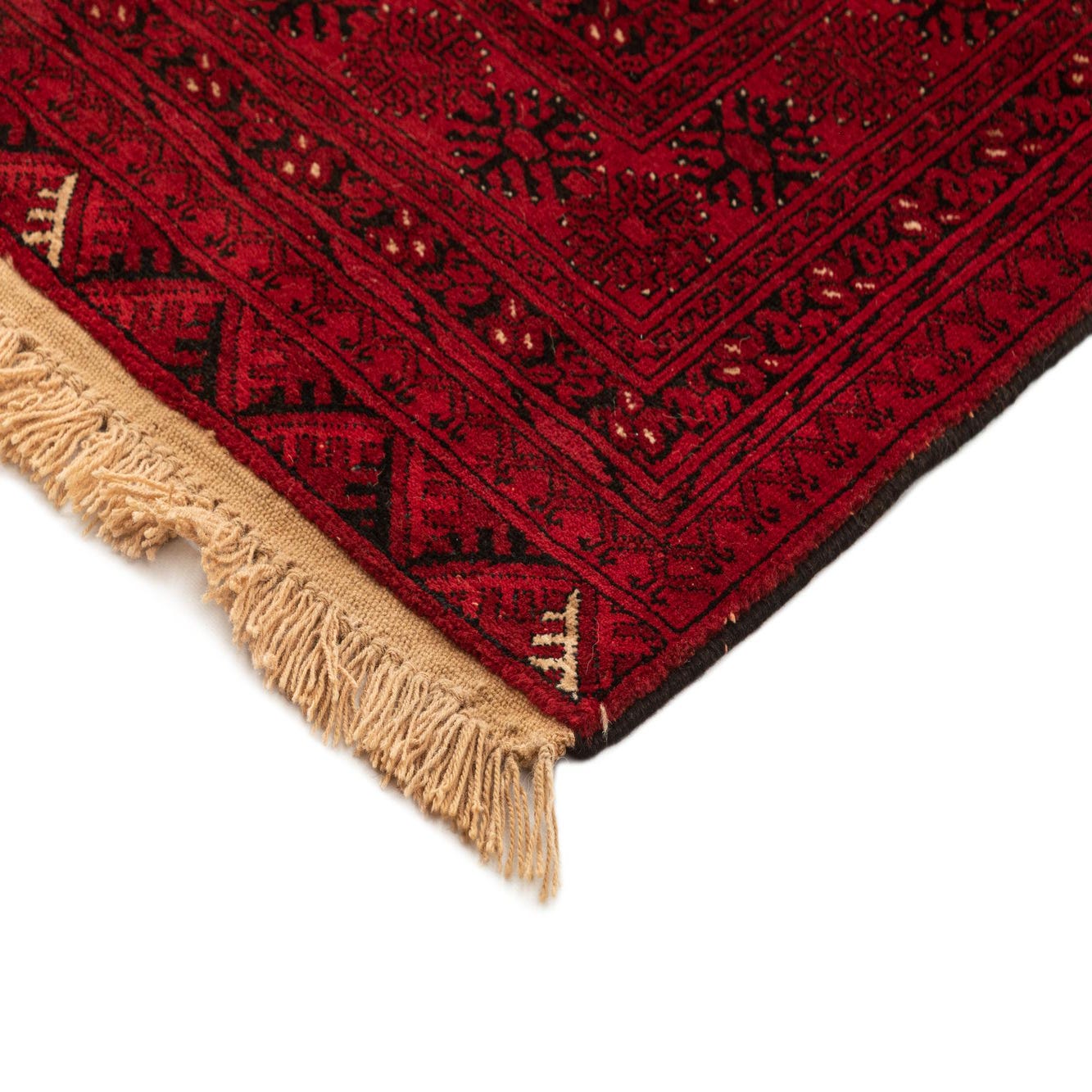 A 4x6 rectangular Rugs.com Afghan Akhche rug in deep red with intricate black and beige tribal patterns and fringed ends.