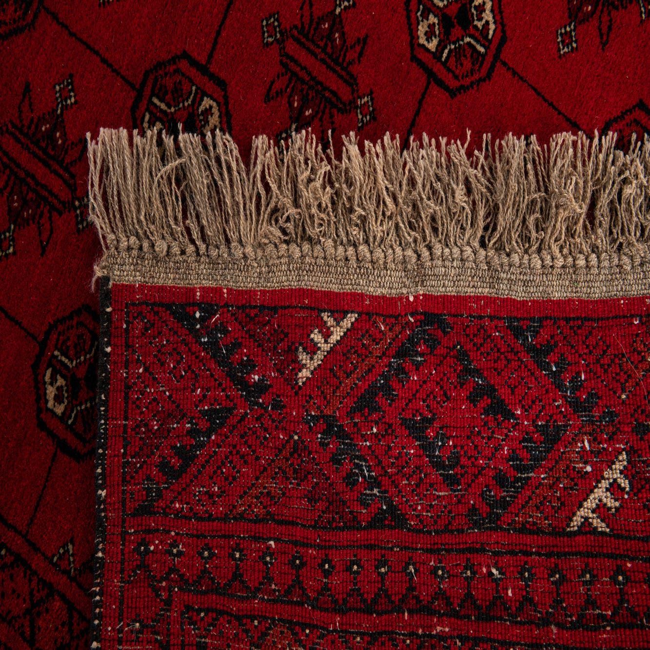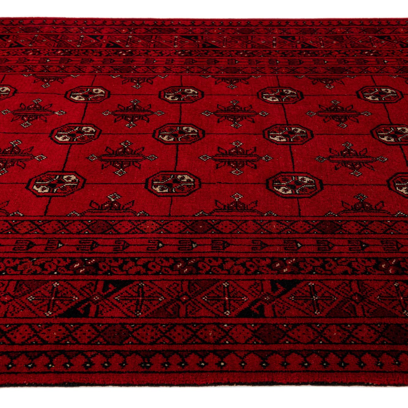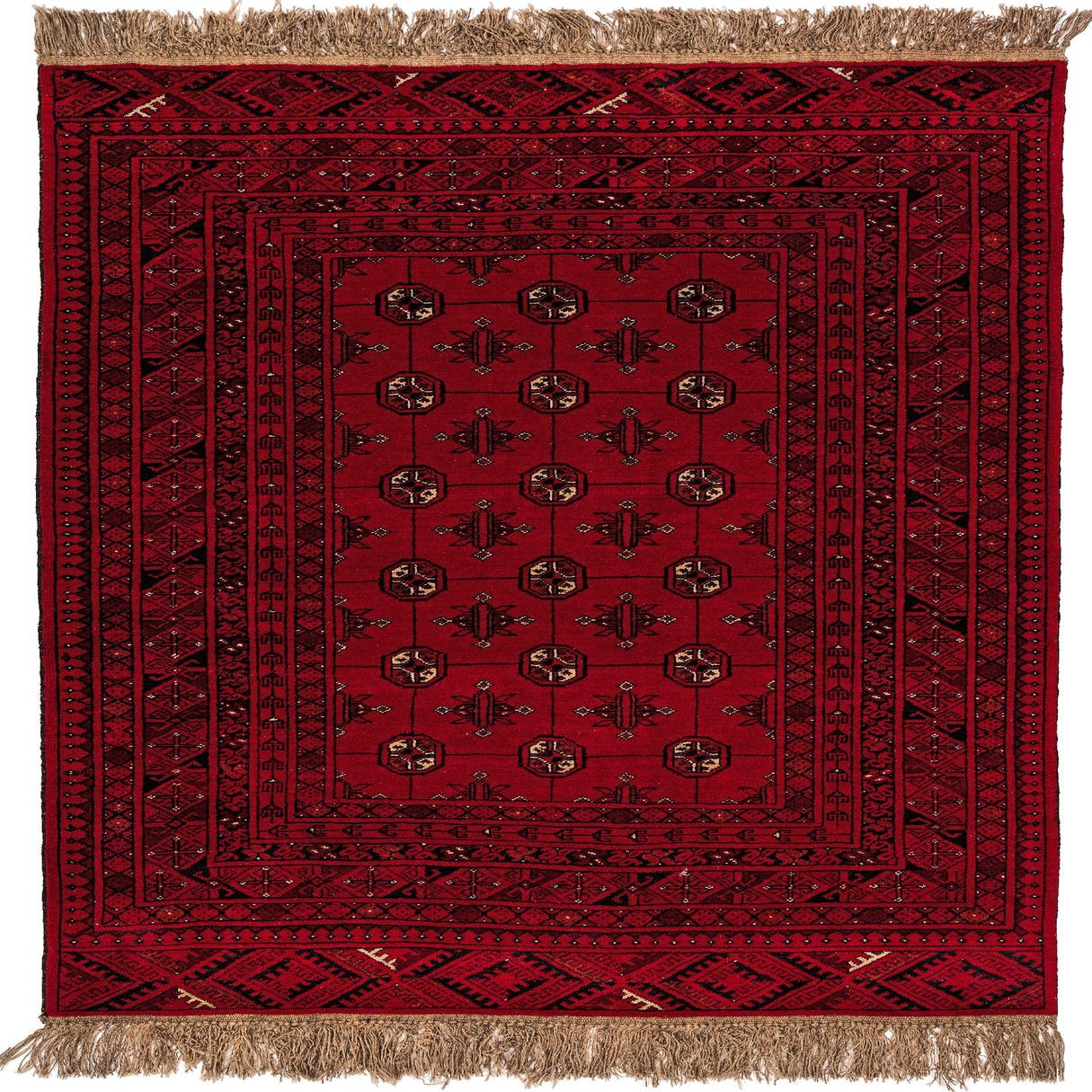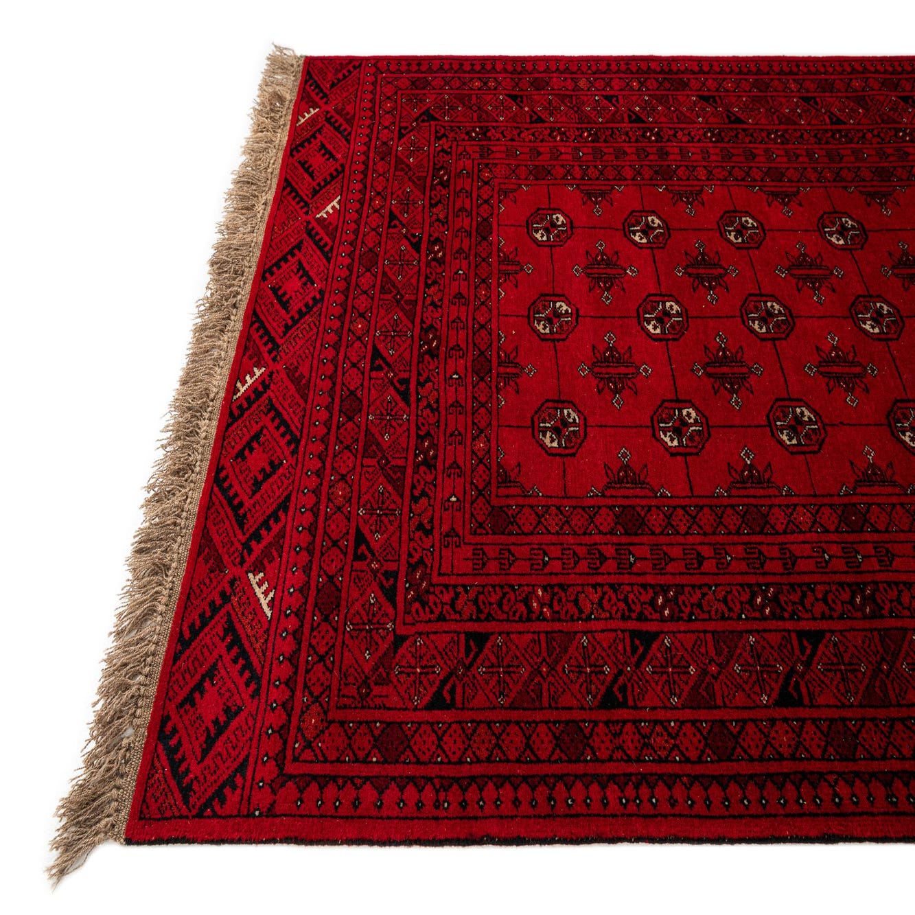 A 4x6 rectangular red tribal wool rug with intricate black and beige geometric patterns and fringe.