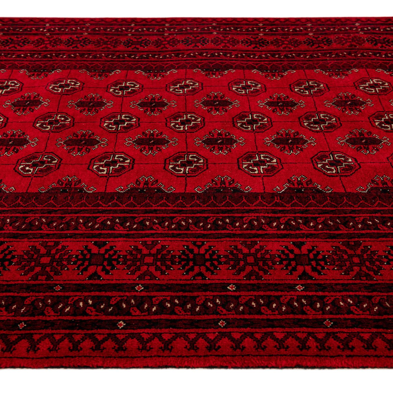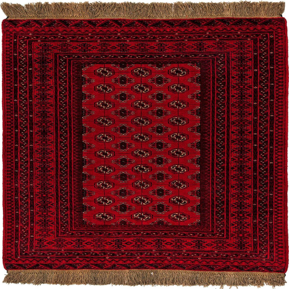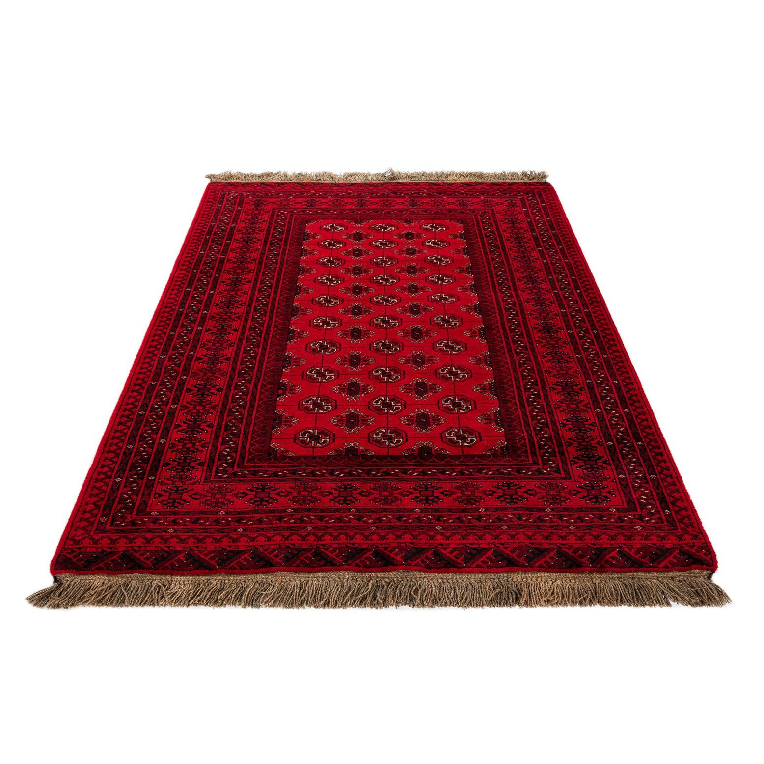 A 4x6 rectangular Afghan Akhche rug in deep reds, featuring traditional tribal patterns and a fringed edge.