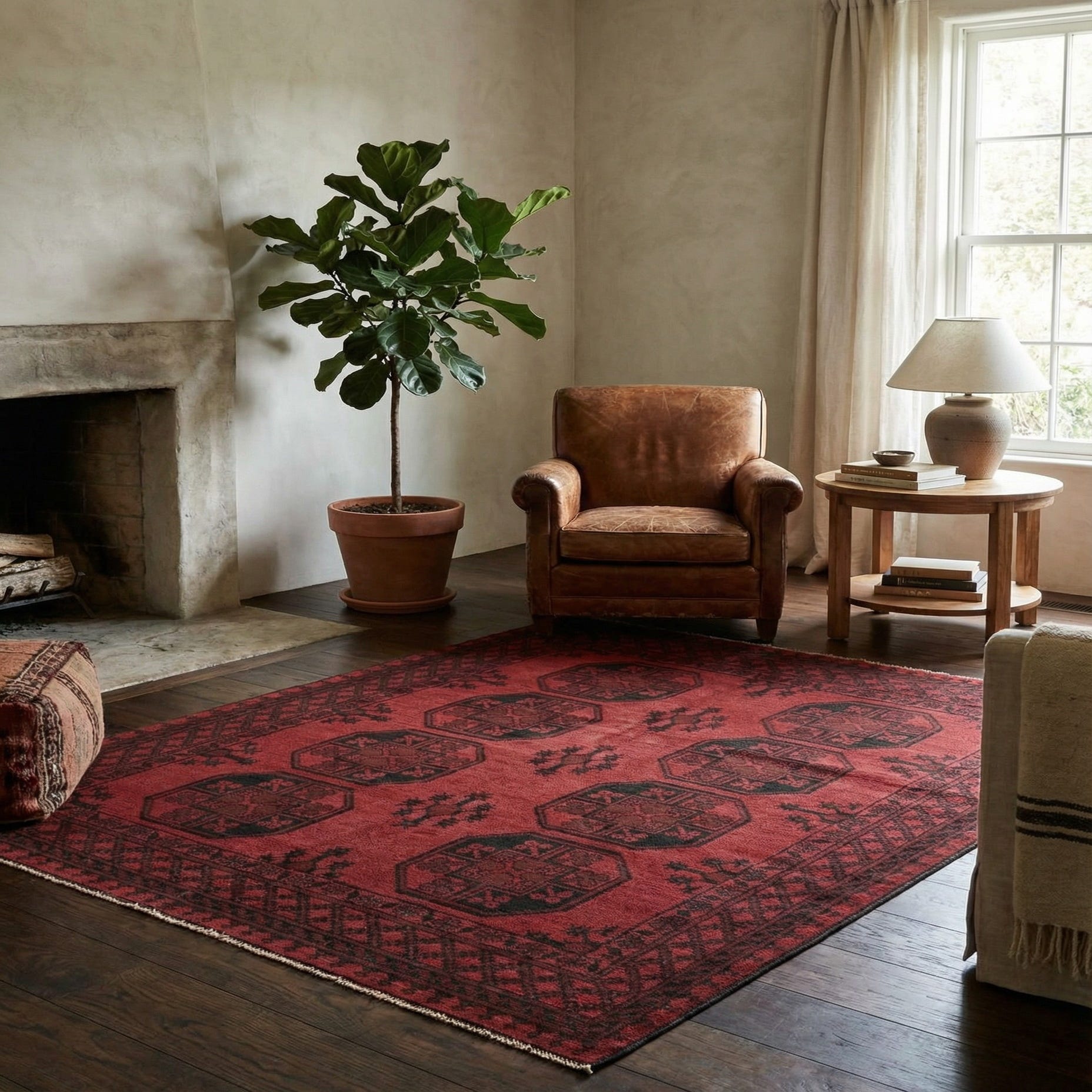 This Afghan Akhche rug is a masterful creation, hand-knotted from 100% wool, offering durability alongside its visual appeal. The piece measures 4x6 and boasts a rich red background, accentuated by patterns in black and maroon, invoking a sense of traditional elegance. The design features a series of geometric motifs, framed by a detailed border that complements the central pattern.