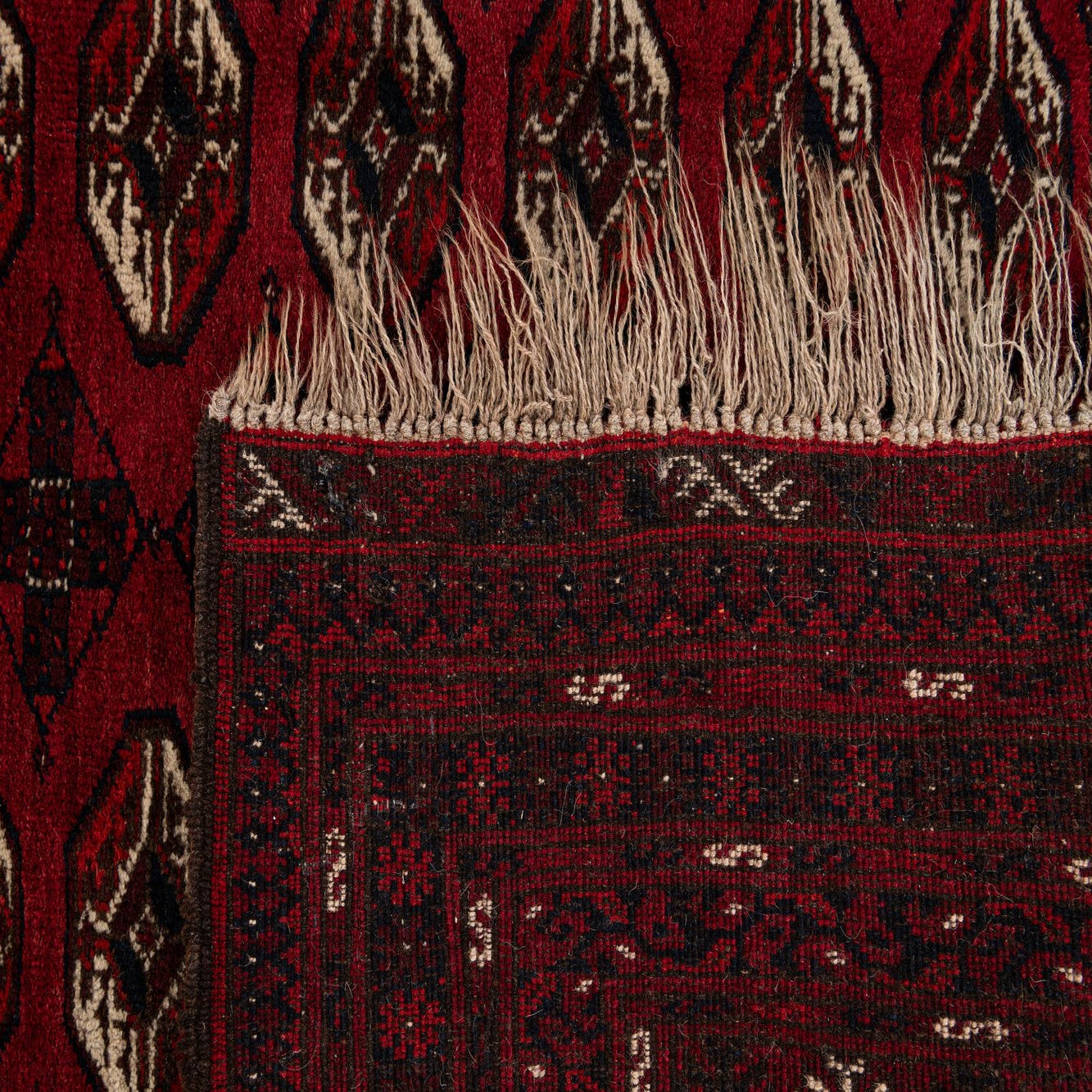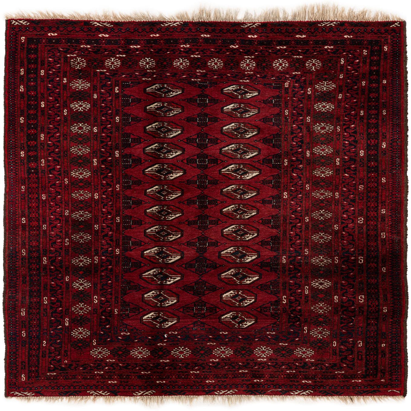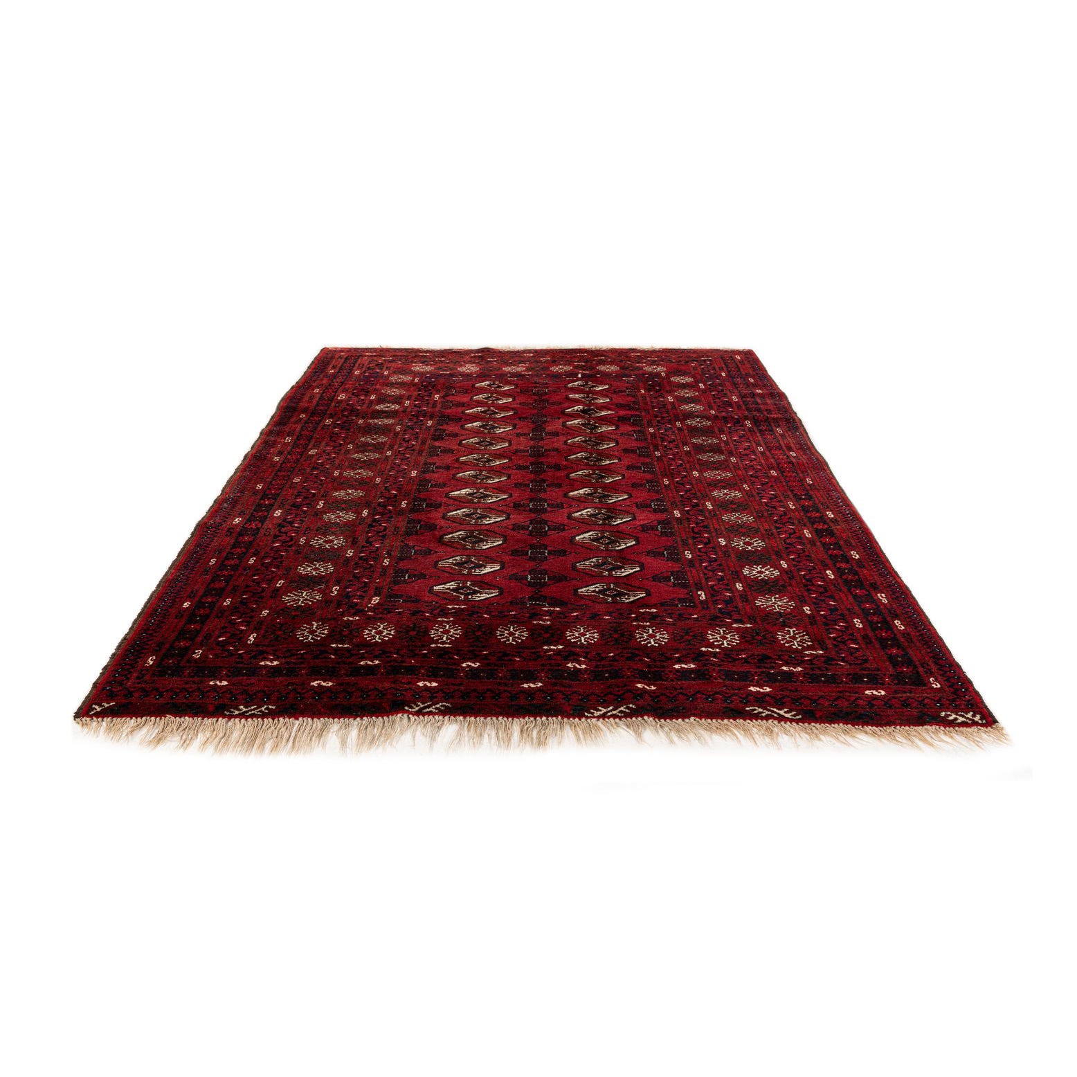 A 4x6 rectangular Afghan Akhche rug in deep reds, featuring traditional tribal patterns and a thin pile.
