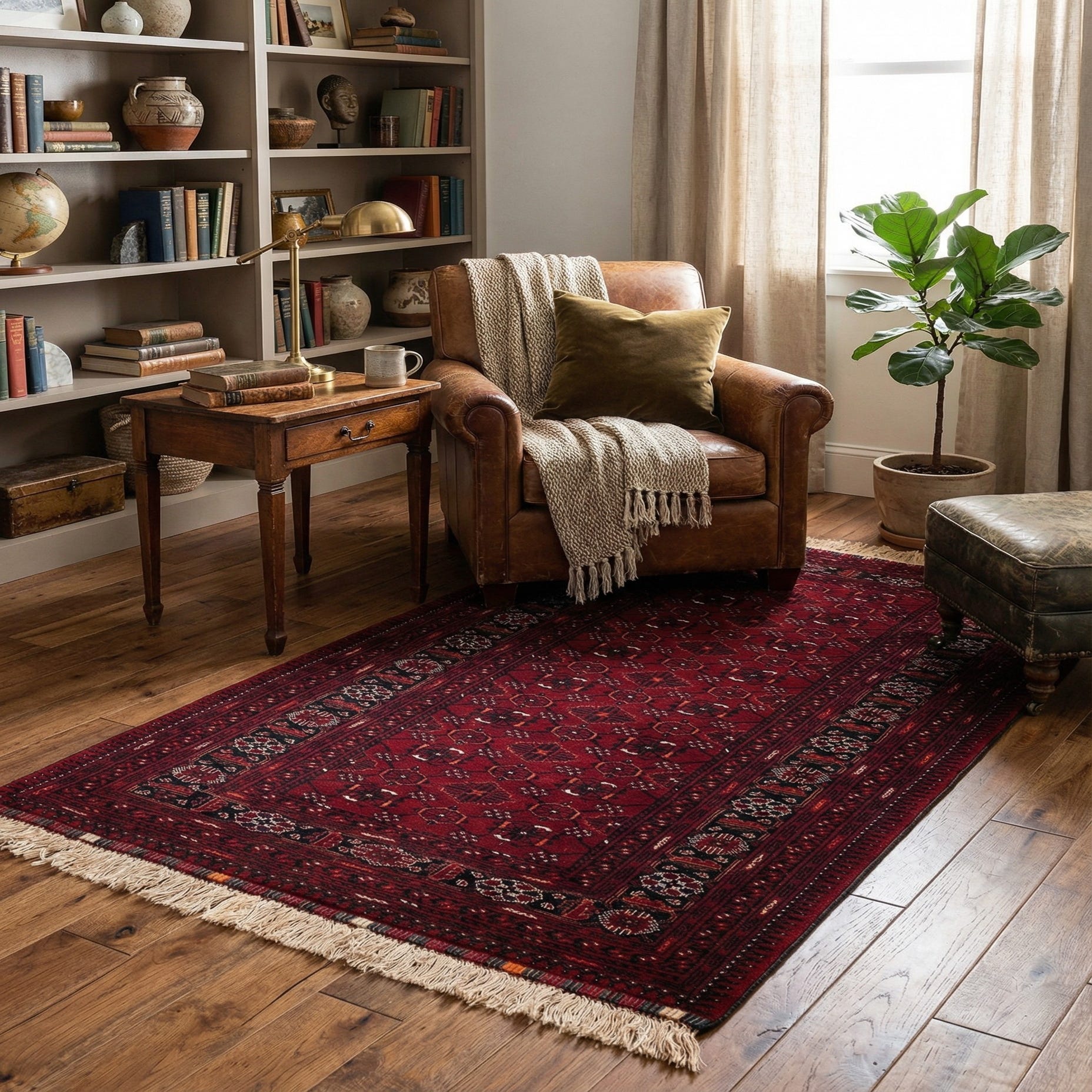 A 4x6 rectangular Afghan Ersari rug in deep red with intricate black and orange tribal patterns, featuring a thin pile and fringed ends.