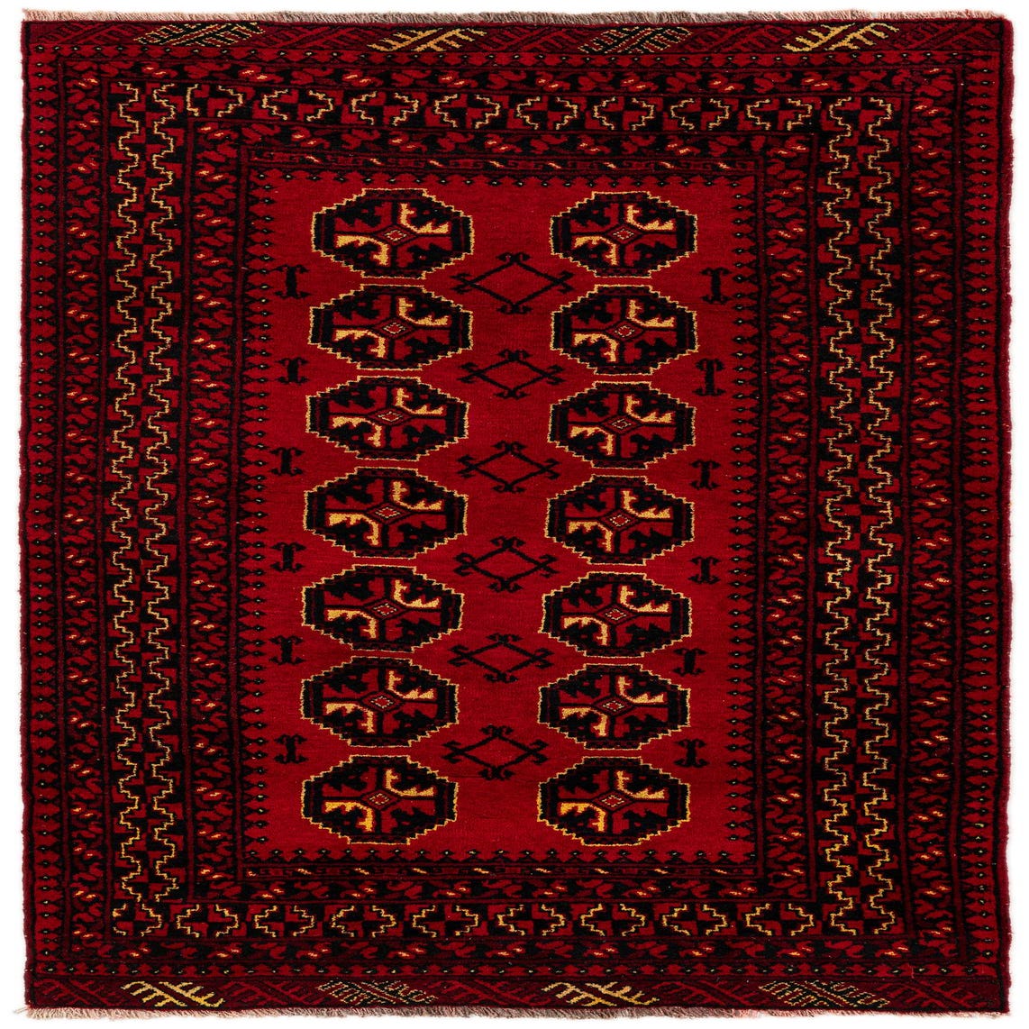 A 4x6 rectangular Afghan Ersari rug featuring a deep red field with black and gold tribal medallions and intricate borders.