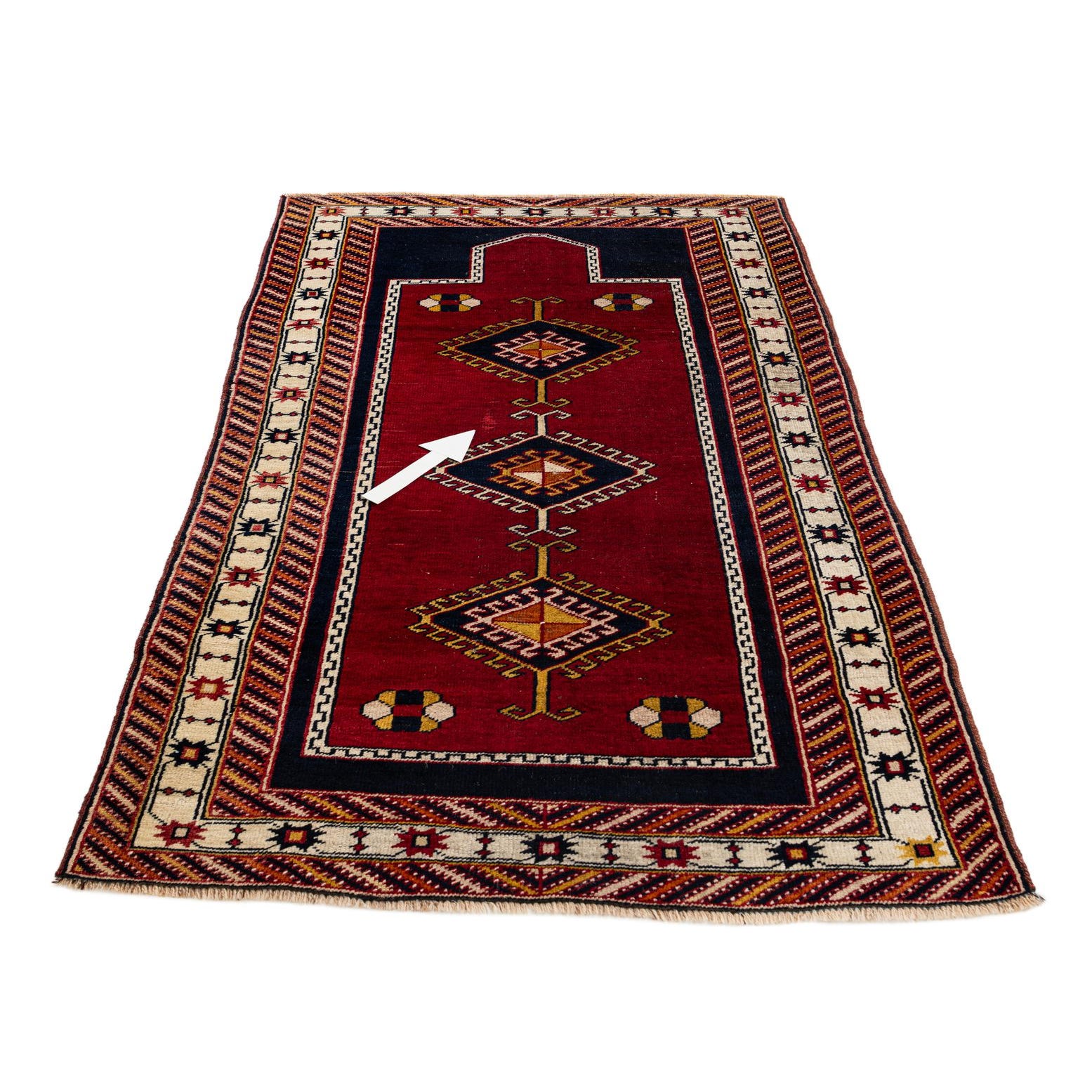 A 4x6 rectangular Anatolian wool rug featuring a deep red field with navy blue, gold, and cream traditional Oriental patterns.
