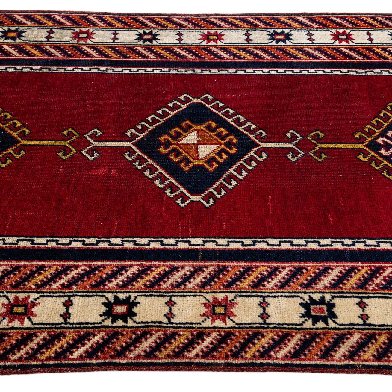 Primary color is Red. Colors in this rug include: Red, Black, Light Brown, Ivory, Yellow.