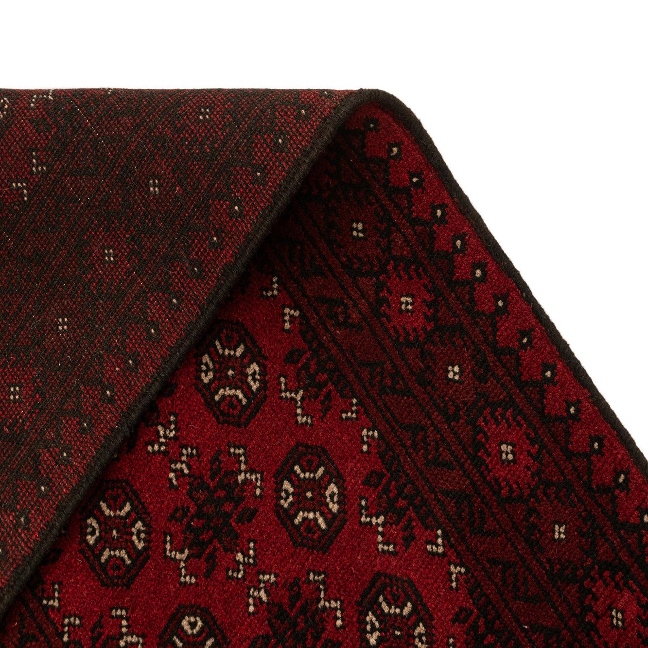 A 4x6 rectangular red wool rug with a traditional repeating medallion pattern, handmade for indoor use.