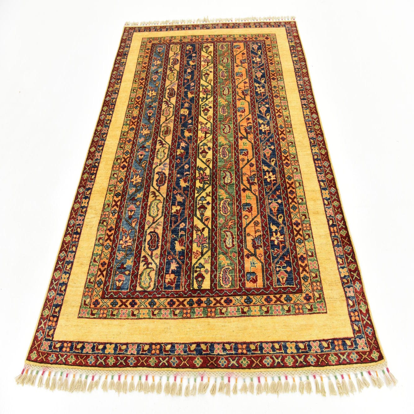 The Ariana Ziegler collection presents a 4x6 hand-knotted rug crafted from 100% hand-spun wool, which boasts a robust texture and a lasting construction. This piece is adorned with a rich red background, complemented by a vivid symphony of colors including blue, cream, gold, green, navy blue, orange, and salmon, bringing a dynamic and versatile palette to any space. The pattern showcases a series of traditional motifs, each intricately detailed and aligned in striped formations, imparting a sense of order and classic elegance.
