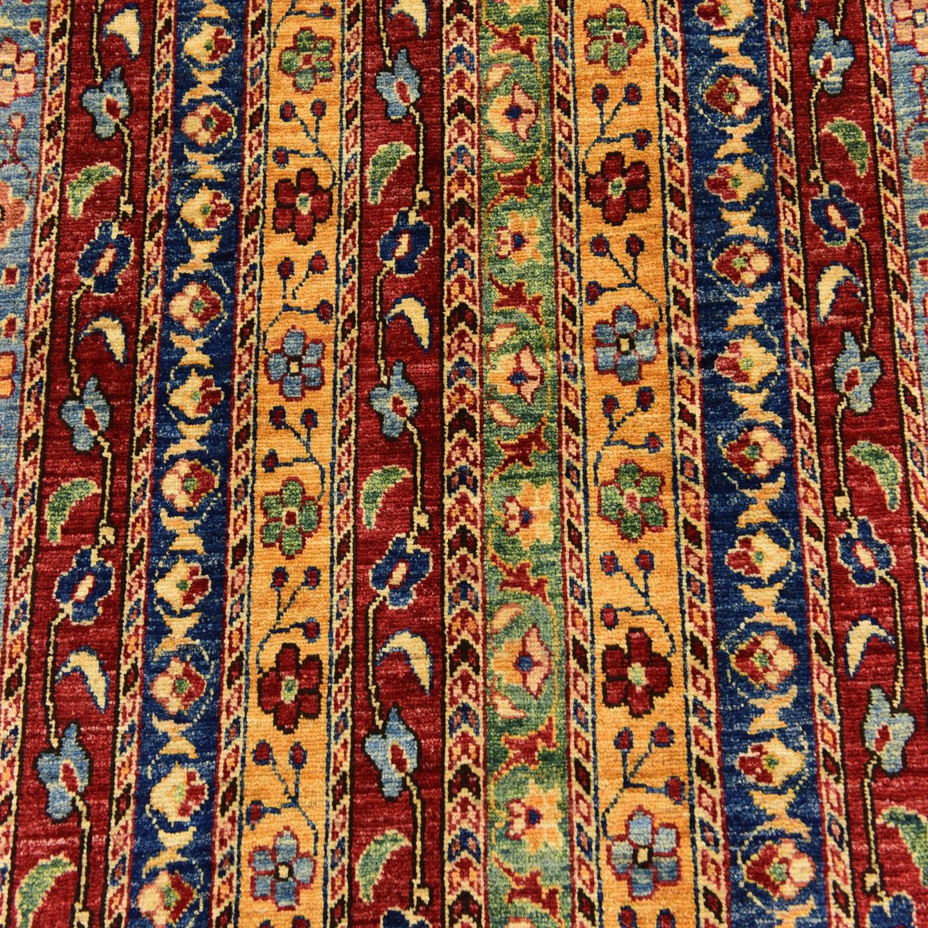The Ariana Ziegler collection presents a meticulously hand-knotted 4x6 rug crafted from 100% hand-spun wool, offering durability alongside its tactile comfort. This piece showcases a rich red background, complemented by a diverse palette including blue, cream, green, orange, navy blue, and peach. Traditional in design, the rug features a series of striped patterns, each stripe adorned with intricate motifs that hint at floral and geometric inspirations. The use of color harmony and variation lends the rug a vibrant yet balanced aesthetic.