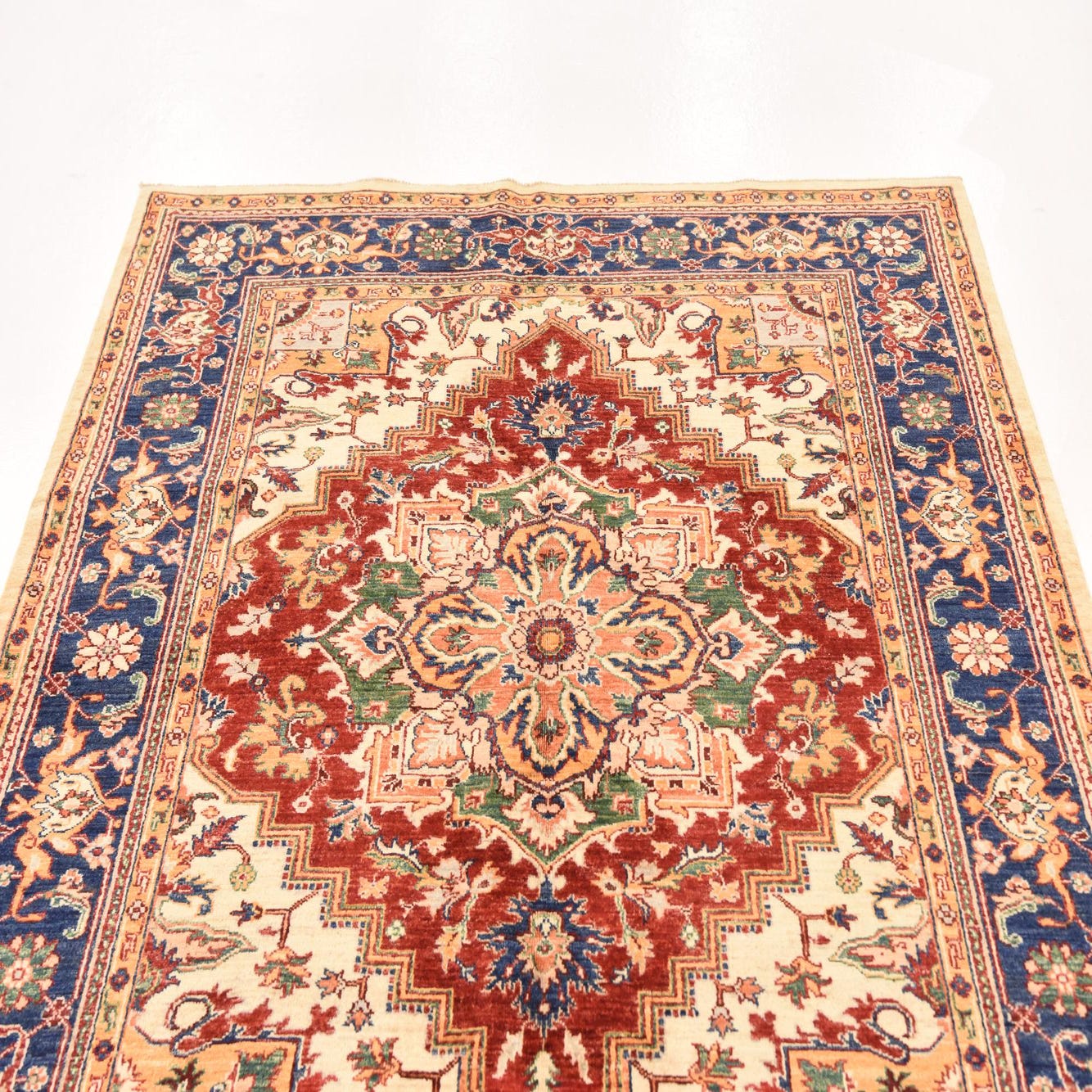 The Ariana Ziegler Collection offers a 4x6 hand-knotted rug crafted from 100% hand-spun wool, notable for its durability and luxurious texture. This piece features an intricate, traditional pattern with a rich red background, accentuated by an elegant color palette that includes black, brown, cream, gold, green, light blue, navy blue, and orange hues. Each color is used strategically to enhance the detailed floral and geometric motifs of the design, creating visual depth and drawing attention to the central medallion which is a focal point of the composition.