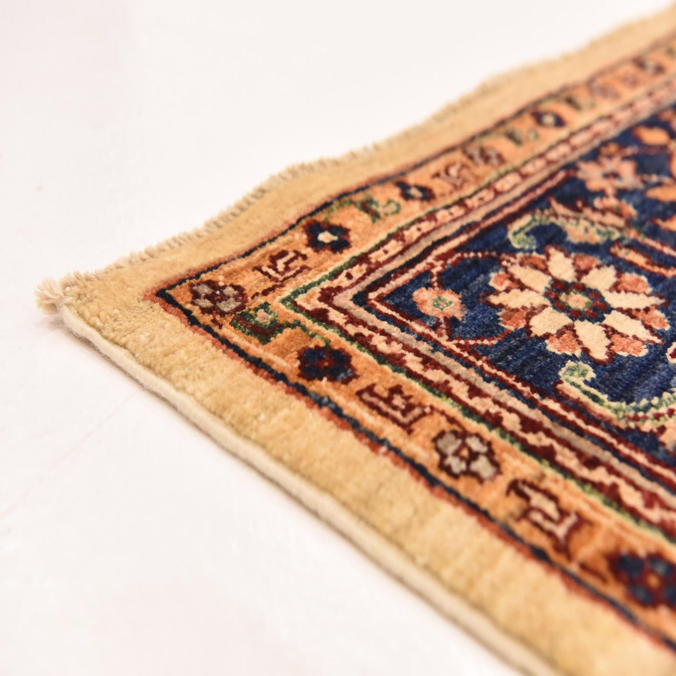 This rug is well-suited for placement in interiors that favor traditional, transitional, or even eclectic decor styles. Its robust color scheme allows it to stand out in a room with muted tones or harmonize with more vibrant decor. The rug could serve as a centerpiece in a living room, under a coffee table, or define a small seating area, imparting warmth and a sense of history to contemporary or classic furniture arrangements. The rug's medium size and ornate pattern render it a versatile choice for various residential settings, including studies, bedrooms, or dining areas where it would contribute to an inviting atmosphere.