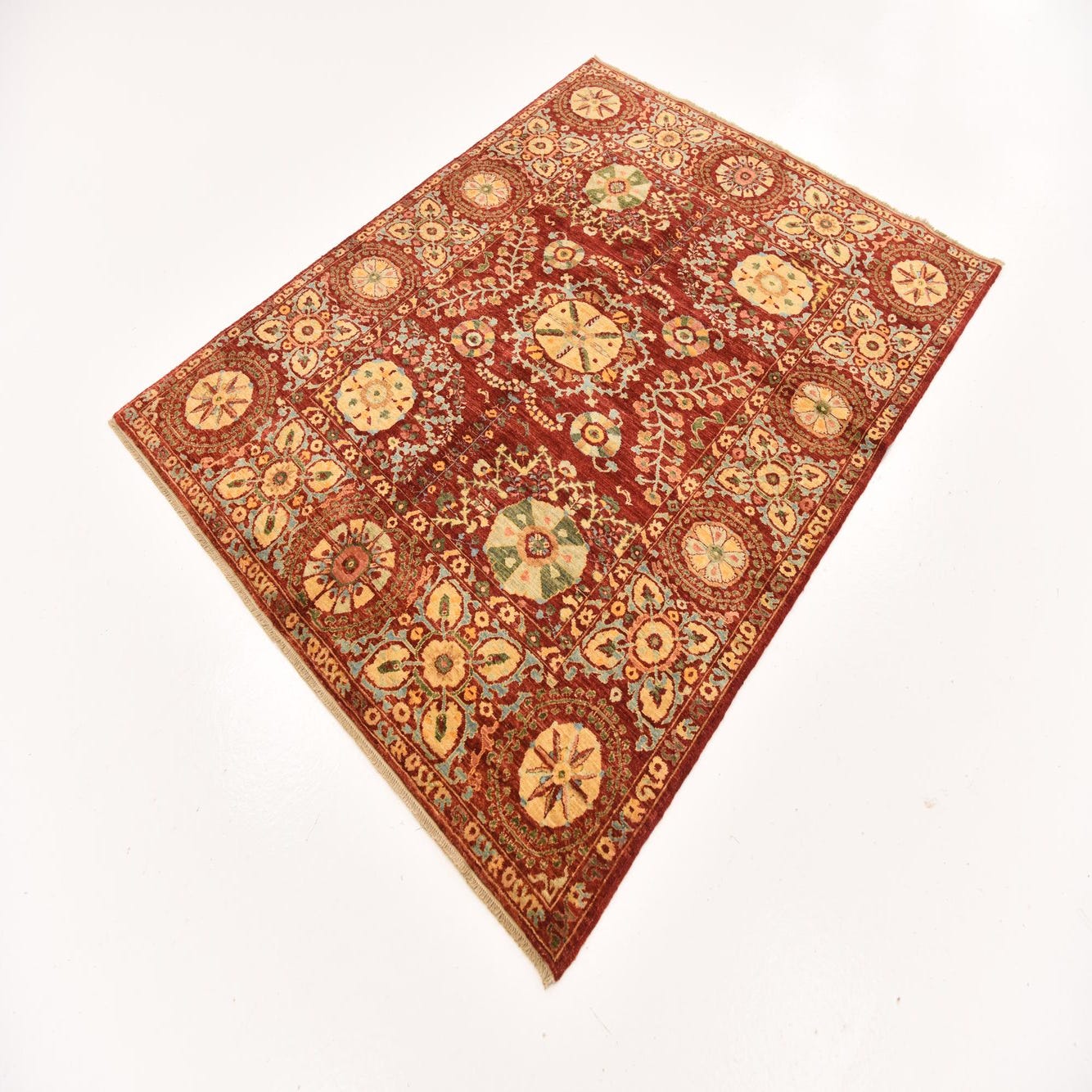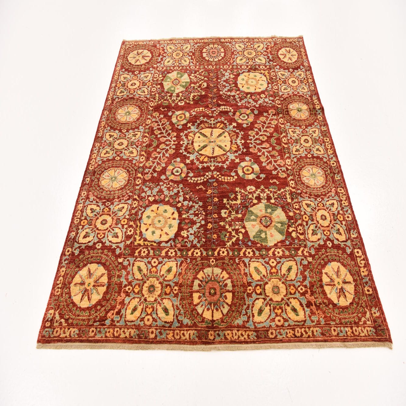 A 4x6 rectangular Ariana Ziegler rug featuring a traditional tribal pattern in rich reds with cream, blue, and gold floral motifs.