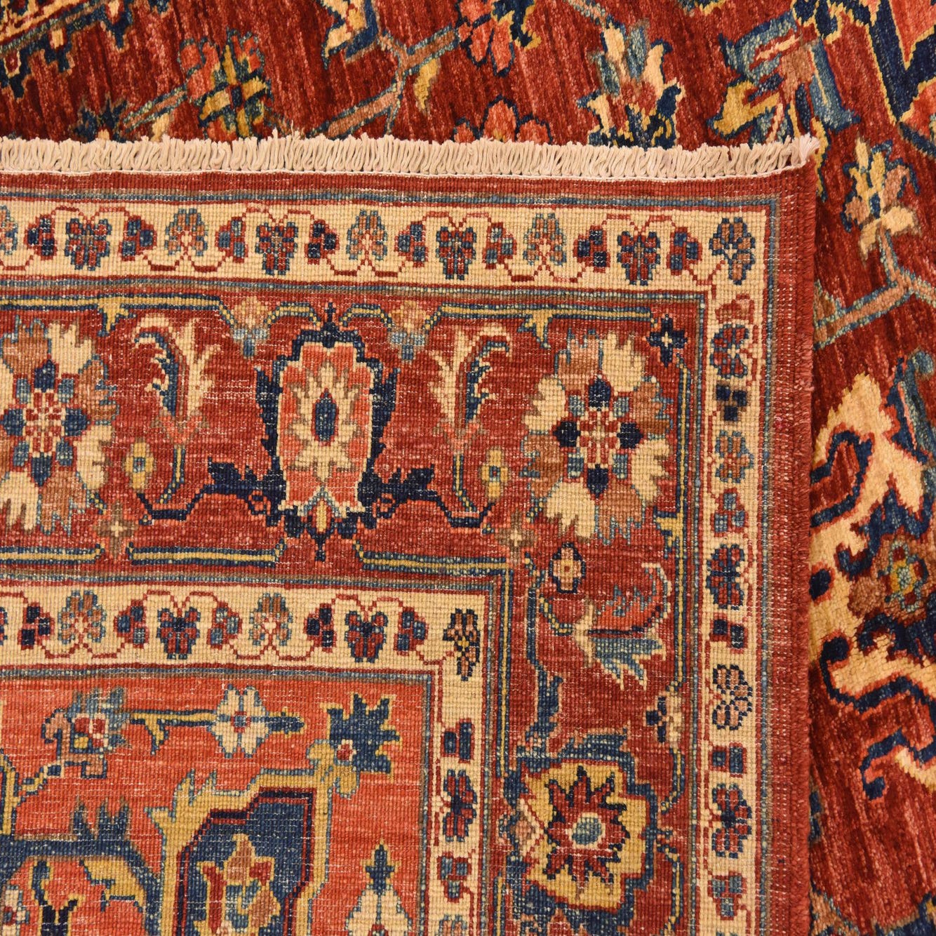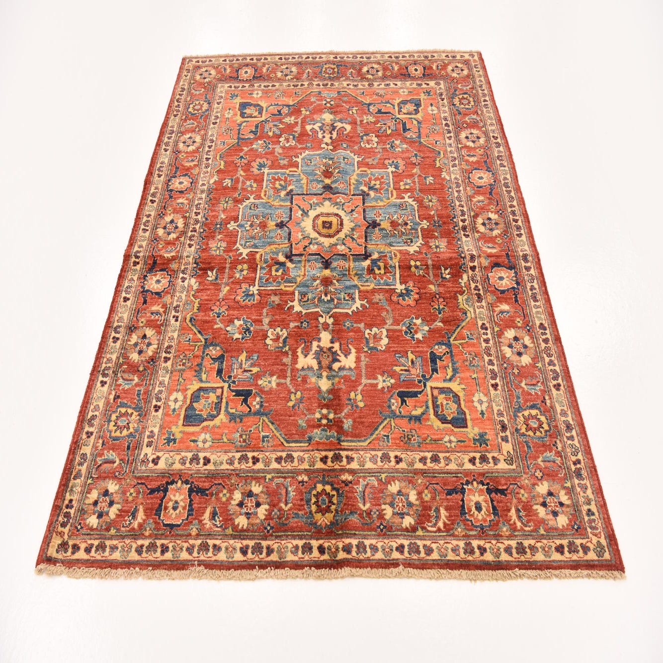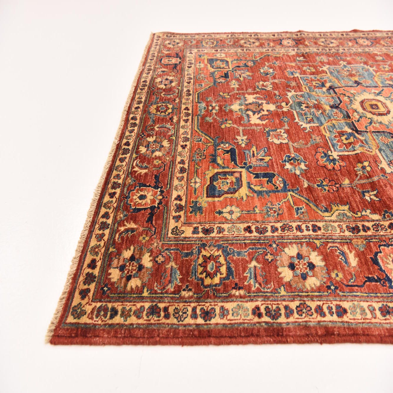The Ariana Ziegler collection presents a meticulously hand-knotted rug crafted from 100% hand-spun wool, offering both durability and tactile pleasure. Measuring 4x6 feet, this rug showcases an intricate pattern articulated through a rich palette of red, black, blue, ivory, navy blue, olive, orange, and gold, with red as the dominant background color.