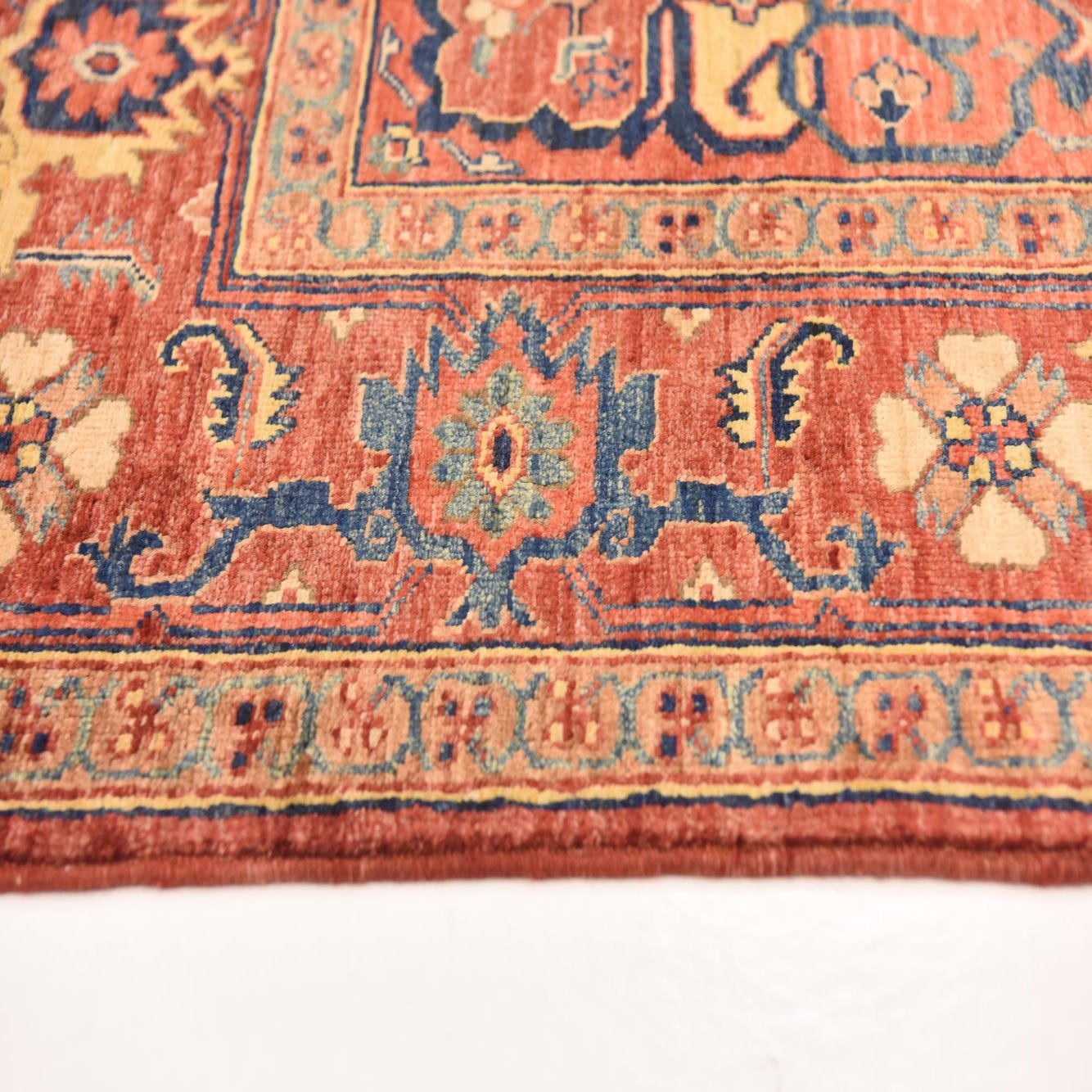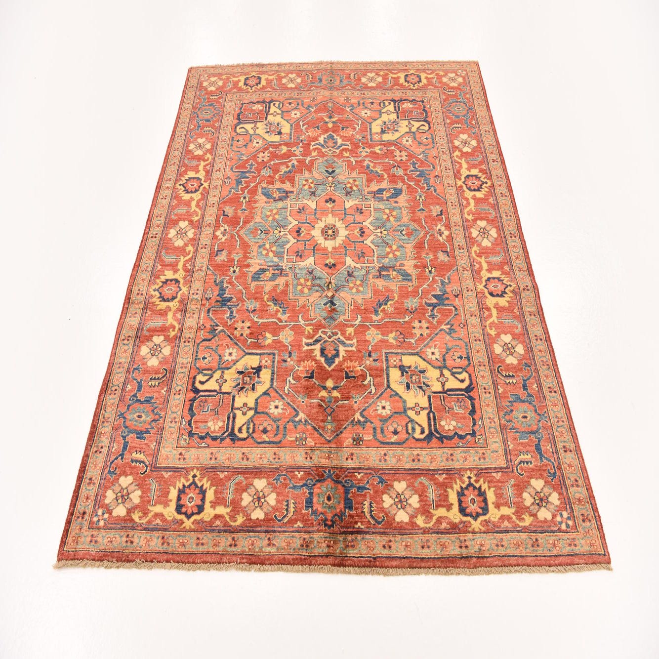 The Ariana Ziegler collection presents a hand-knotted 4x6 rug crafted of 100% hand spun wool, notable for its resilience and ability to capture fine detail. This rug displays a central medallion pattern surrounded by intricate geometric and floral motifs, creating a symmetrical and balanced design. The dominant red background is complemented by a rich palette that includes black, blue, brown, cream, gold, navy blue, orange, and tan. The variety of colors is harmoniously blended to produce a cohesive yet visually intriguing piece.