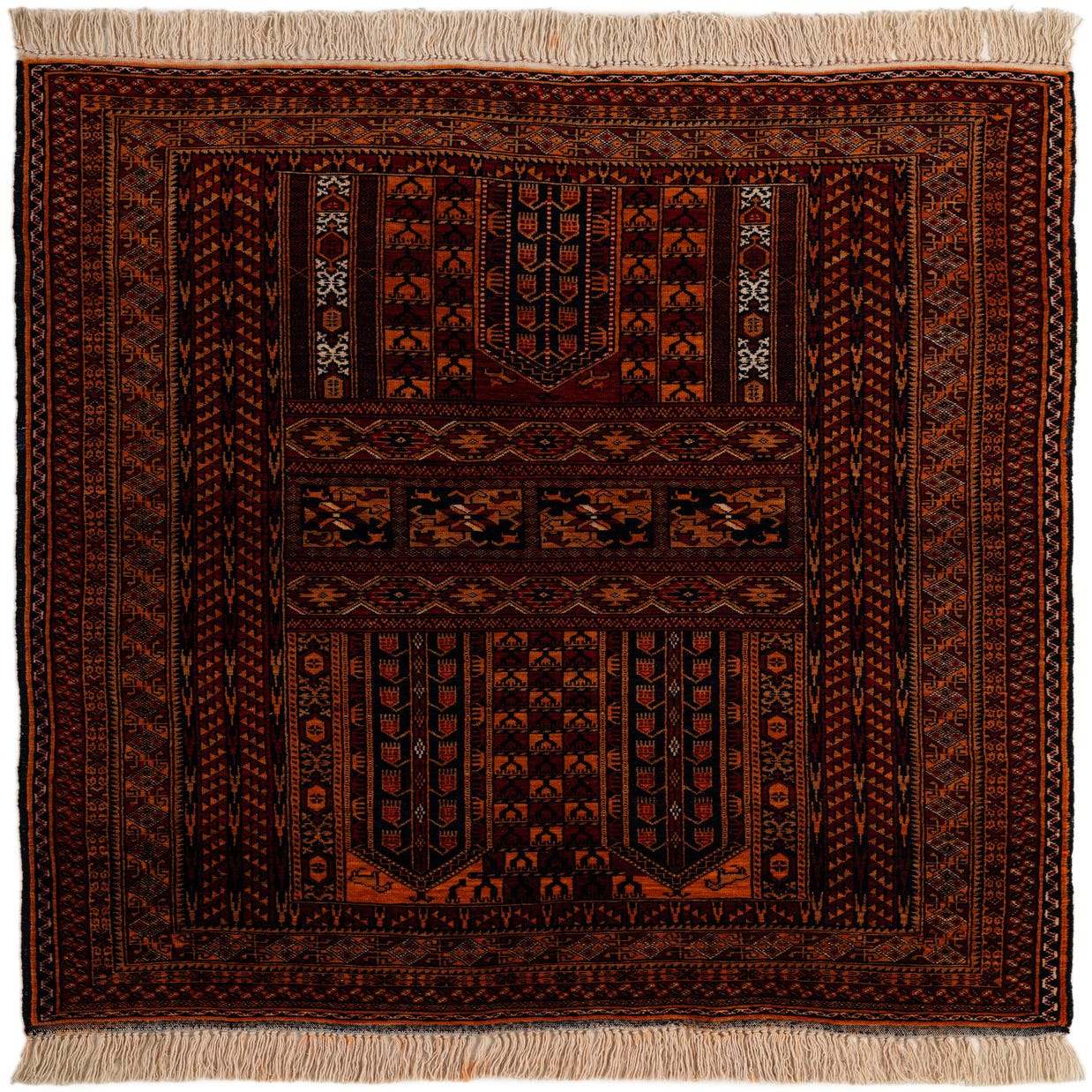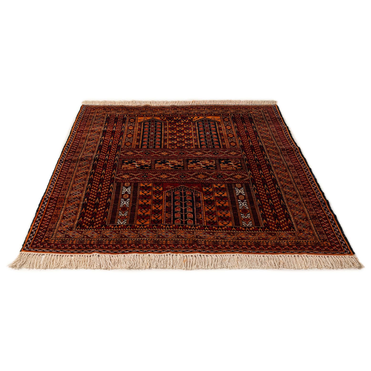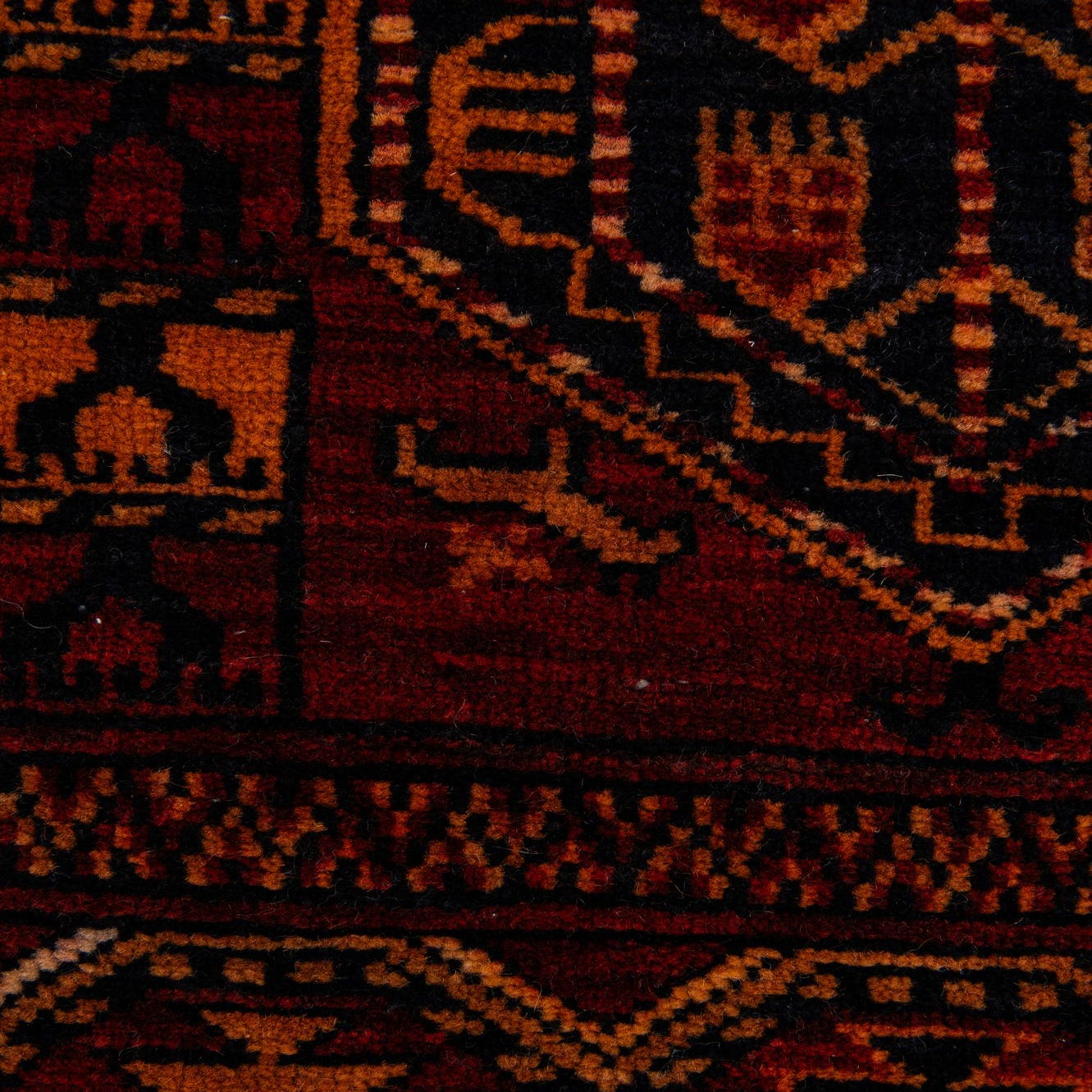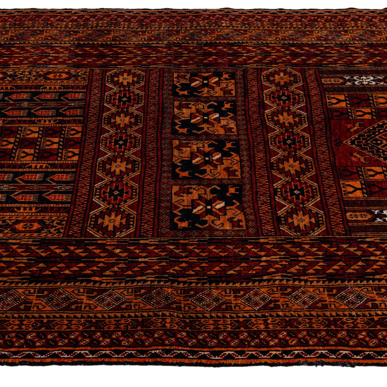 A 4x6 rectangular Balouch rug with intricate tribal patterns in deep reds, oranges, and black, featuring a flat pile and fringe.