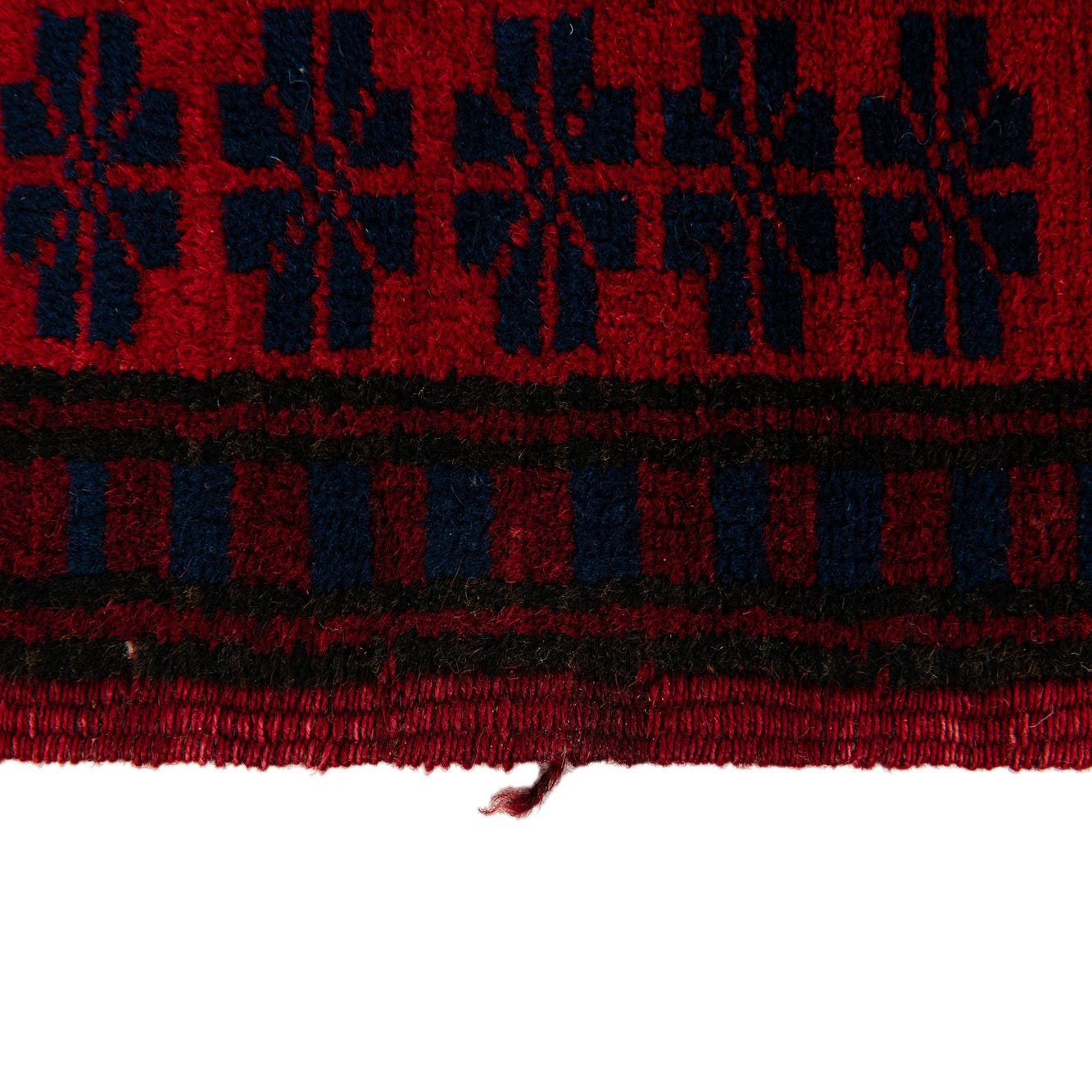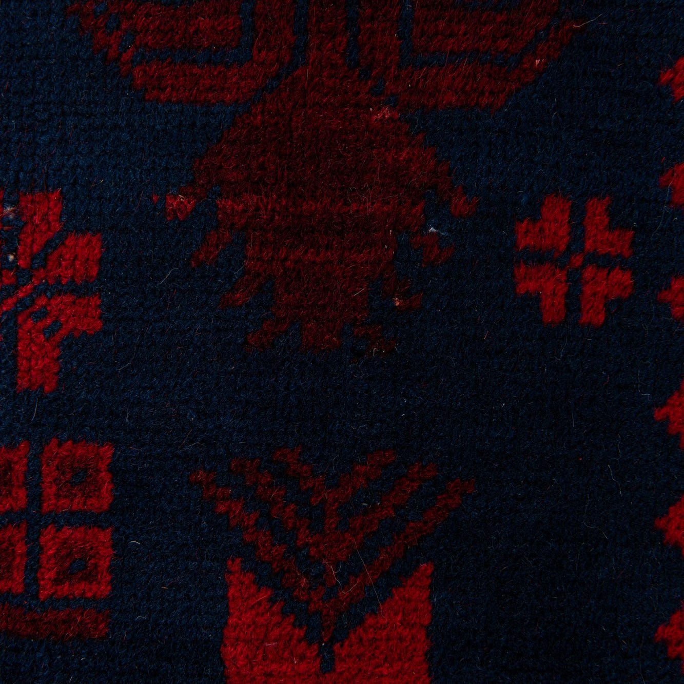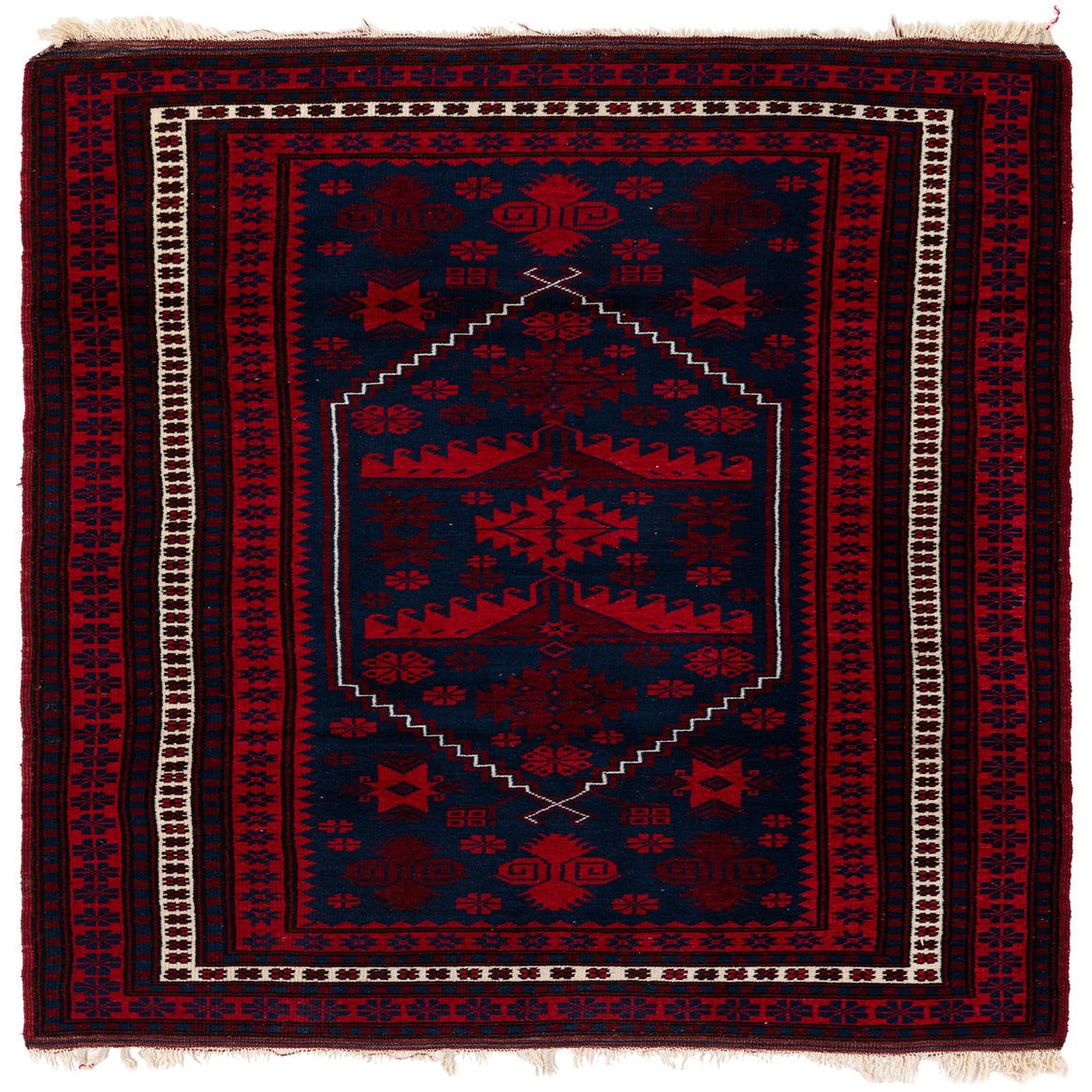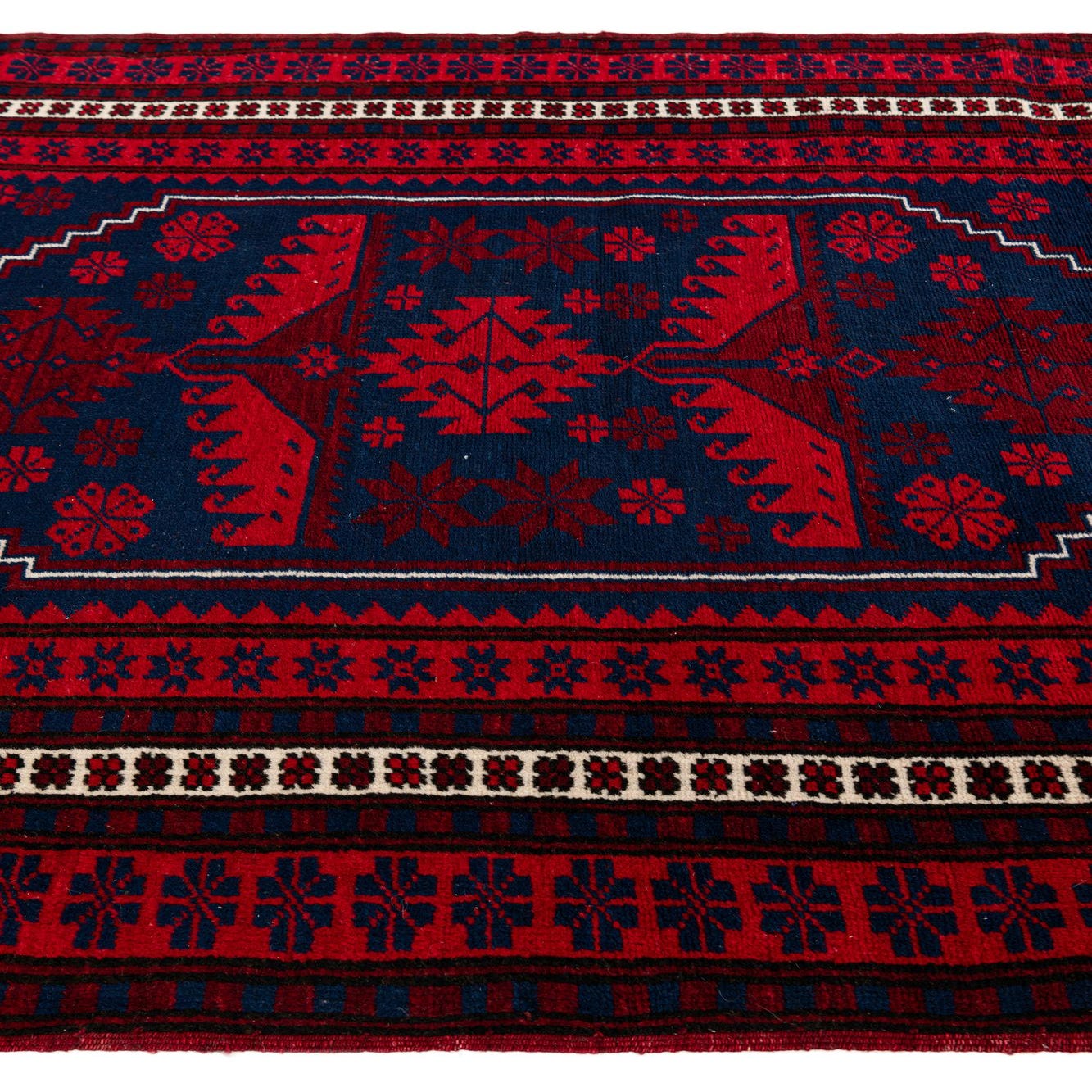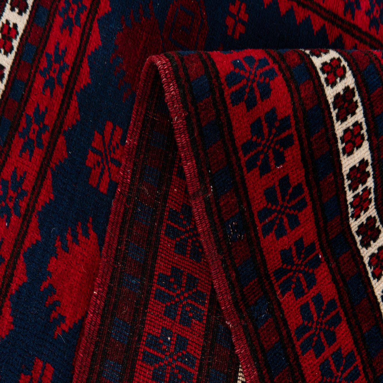 Primary color is Red. Colors in this rug include: Red, Navy Blue, Ivory, Burgundy.