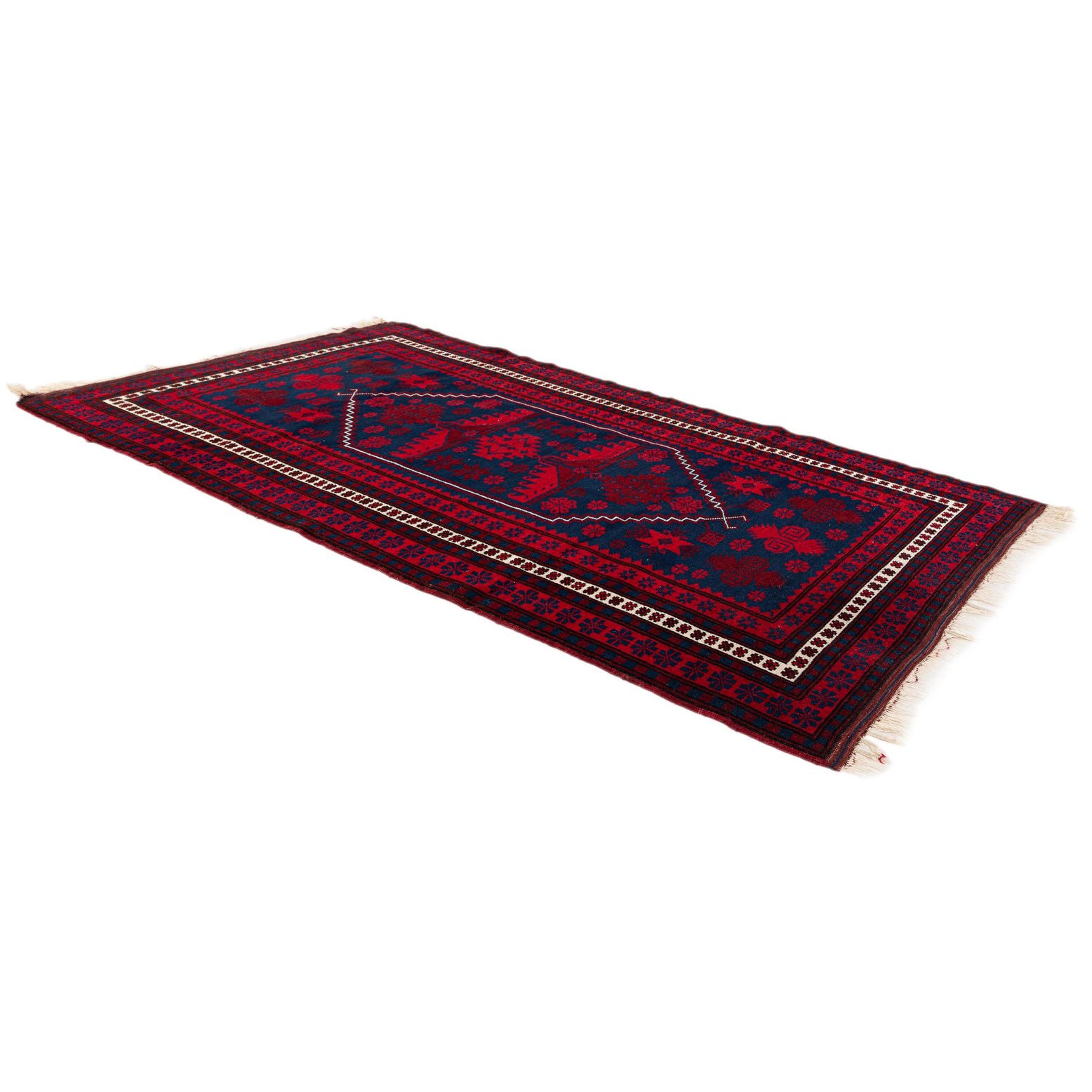 A 4x6 rectangular Balouch rug in deep red and navy blue, featuring traditional Persian and tribal patterns with a central medallion.