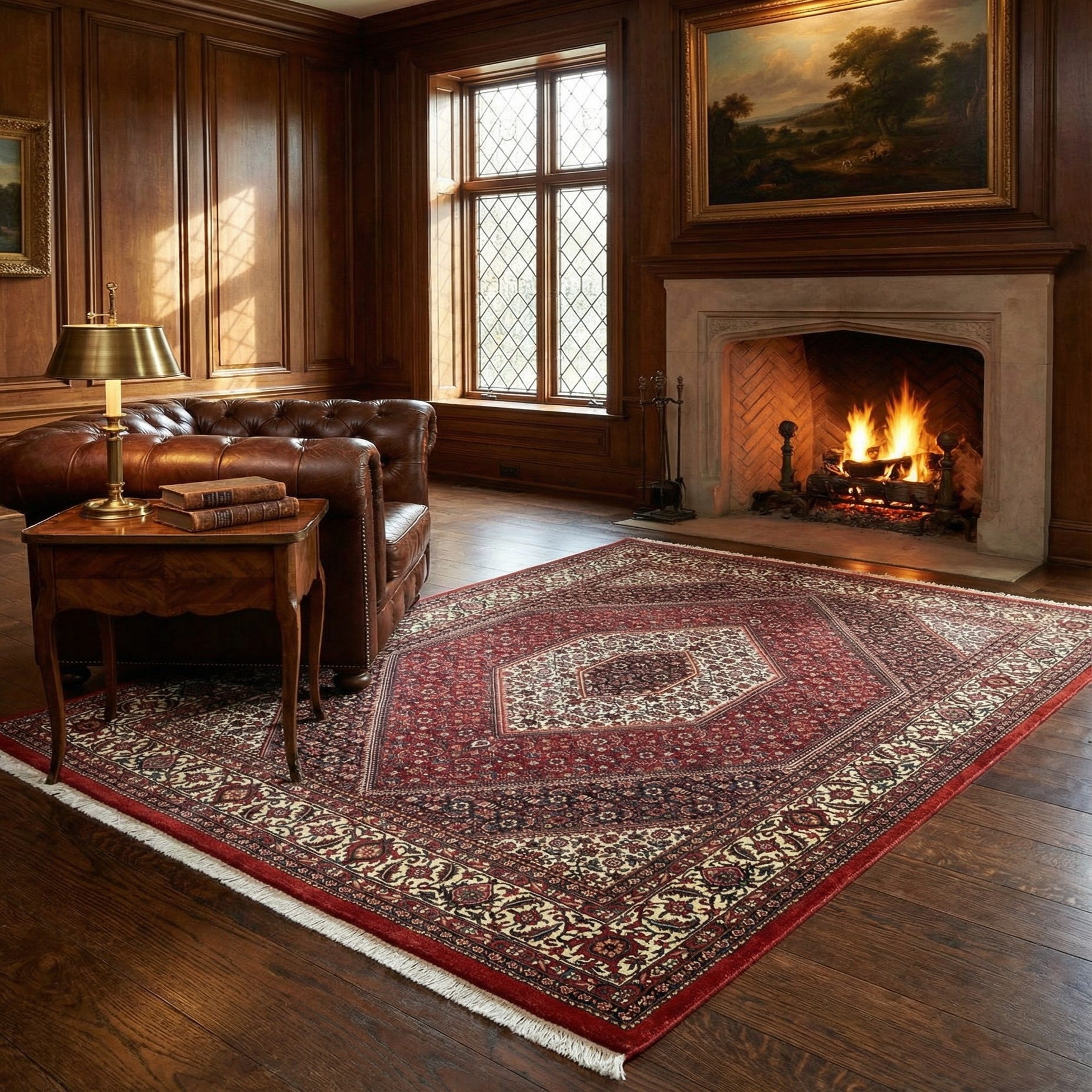 The Bidjar collection presents a 4x6 hand-made wool rug that showcases a robust red background with cream detailing, creating a striking contrast. Its intricate pattern consists of a central medallion surrounded by a dense field of floral motifs and intertwined vines, bordered by a dynamic series of smaller guard borders and a primary cream border that accentuates its geometric symmetry.