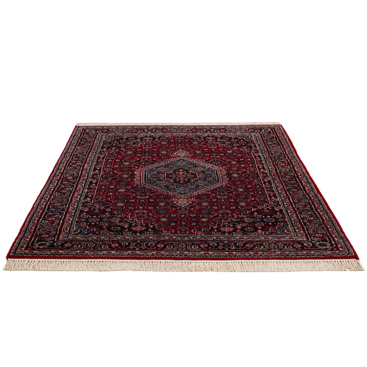 A 4x6 rectangular red Bidjar wool rug with a traditional Oriental medallion pattern and fringe.