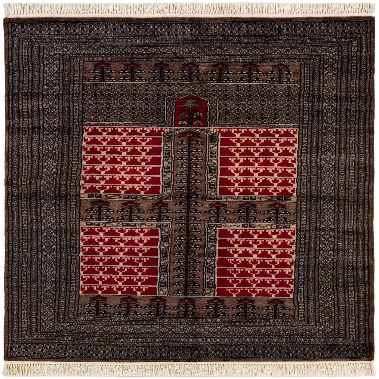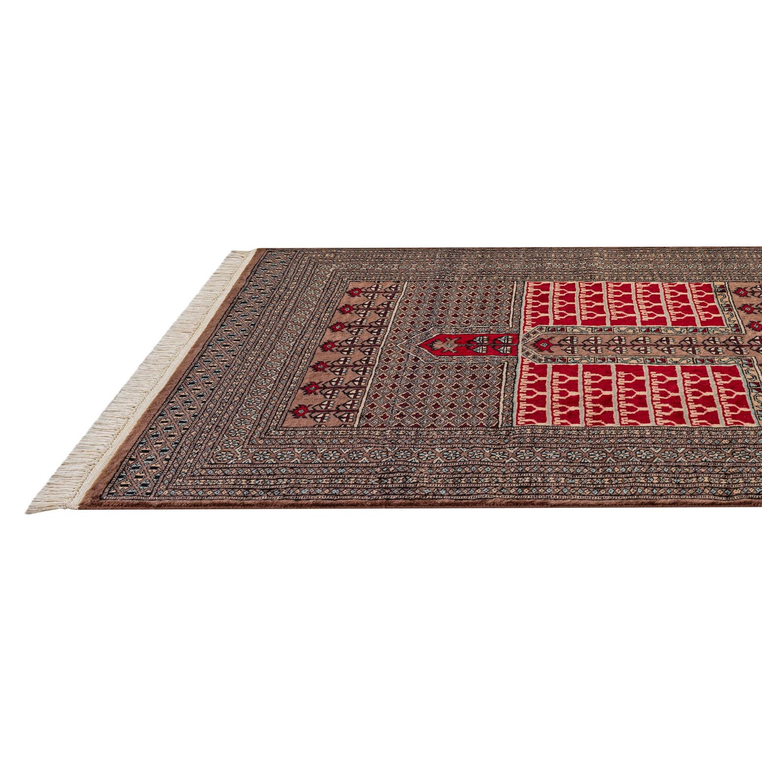 A 4x6 rectangular Bokhara tribal rug featuring a rich red and brown pattern with intricate geometric and floral motifs, handmade from wool.