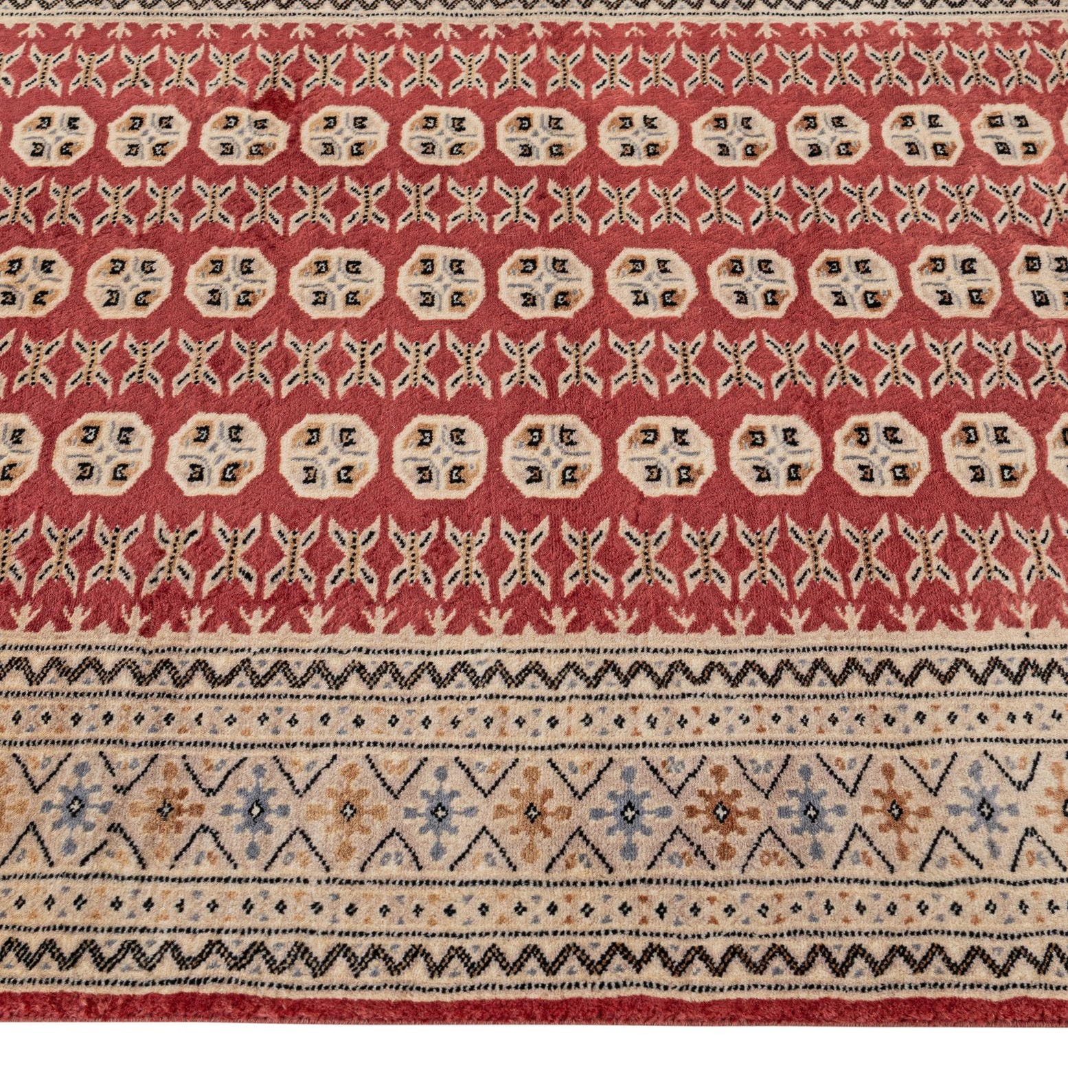 A 4x6 rectangular red Bokhara rug with a central tribal pattern and intricate borders, handmade from wool.
