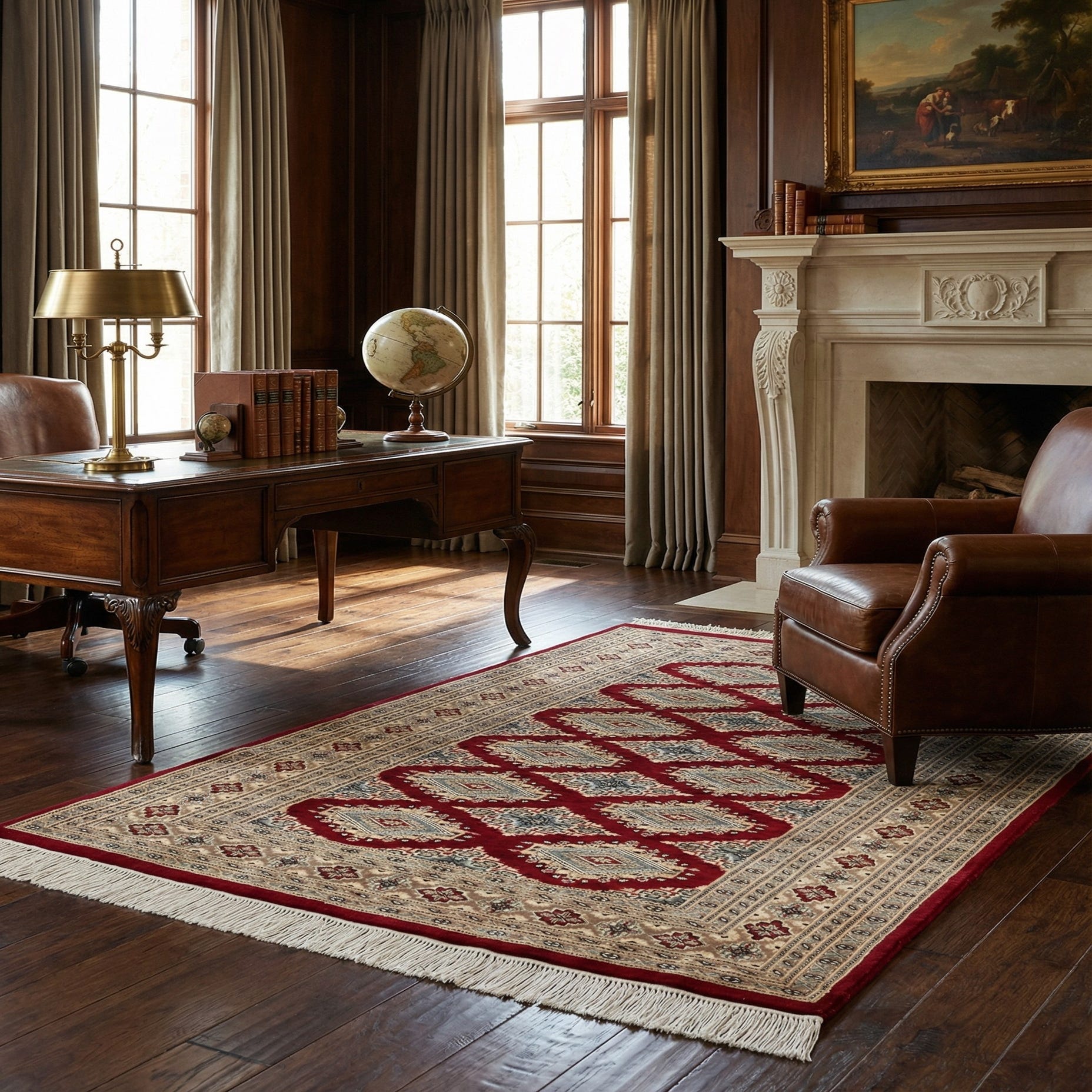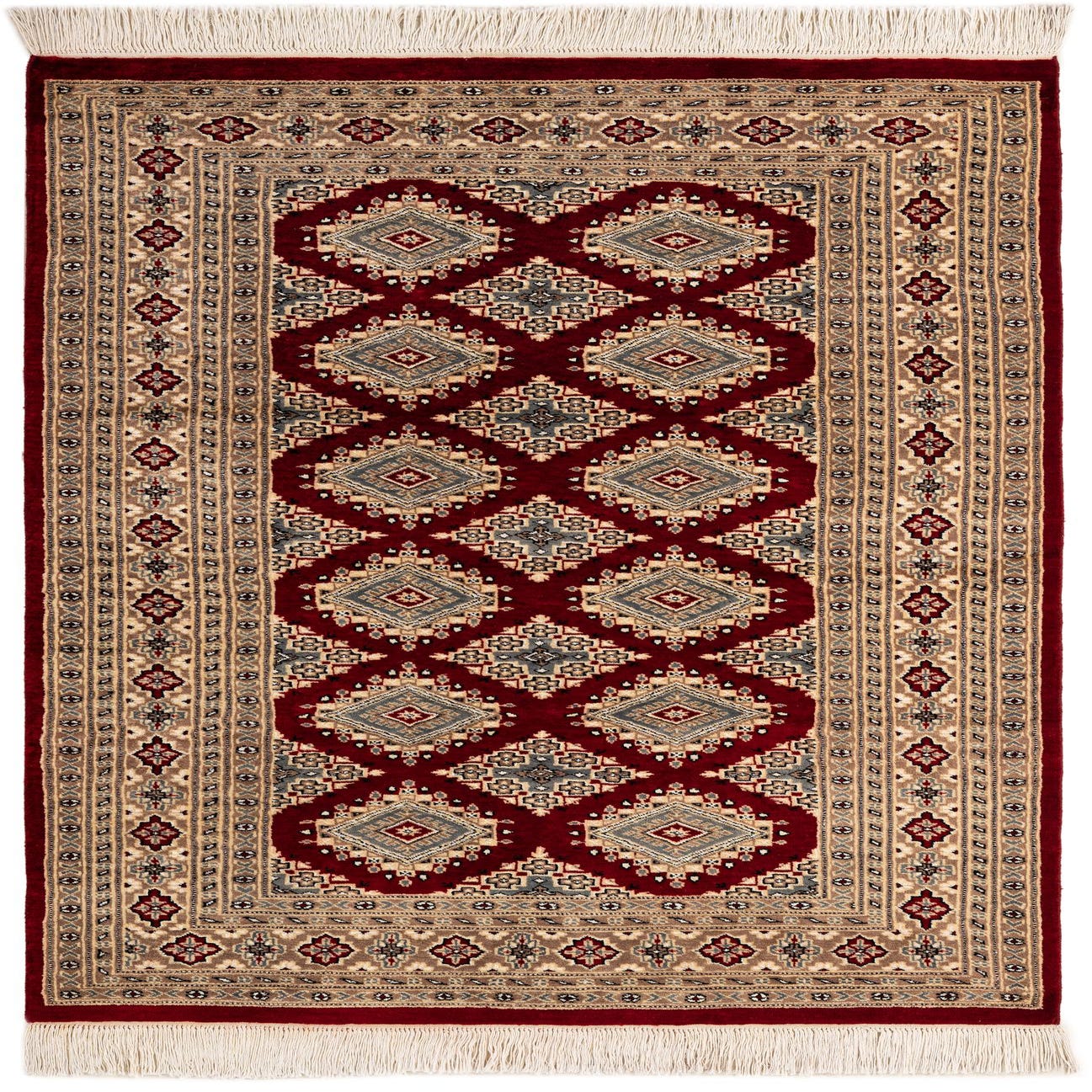 A 4x6 rectangular Bokhara rug with a deep red field and intricate tribal patterns in cream, blue, and brown, featuring a decorative border and white fringes.