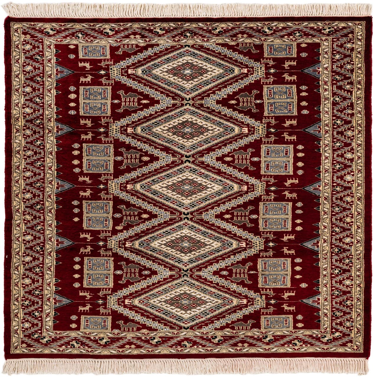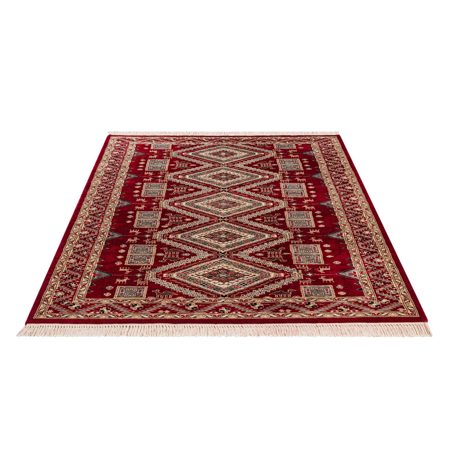 A 4x6 rectangular red Bokhara rug with a traditional tribal pattern, featuring diamond medallions and animal motifs.