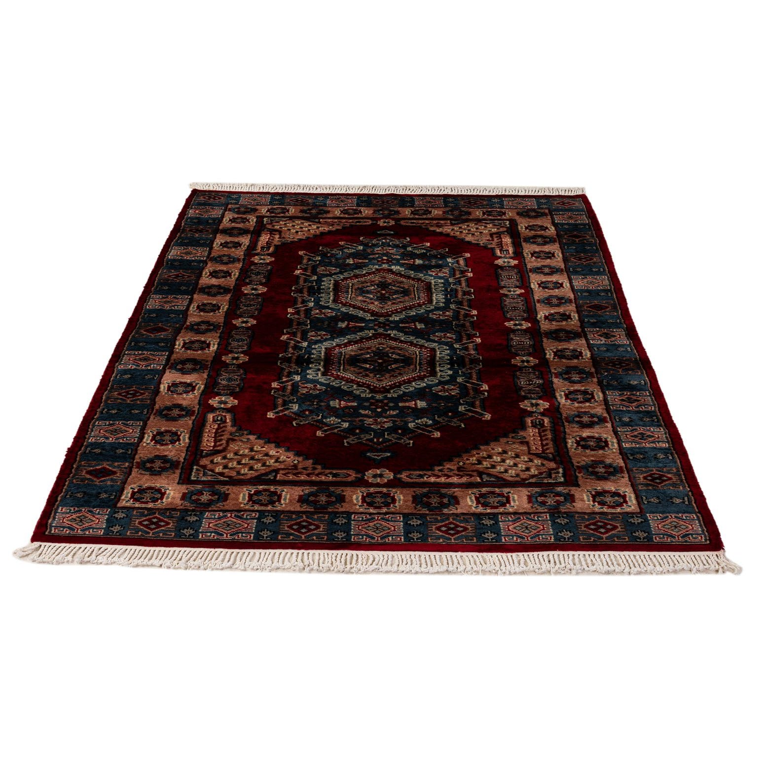 A 4x6 rectangular Bokhara tribal rug with a rich red field and a central medallion in blue, beige, and red, featuring intricate Oriental patterns and fringe.