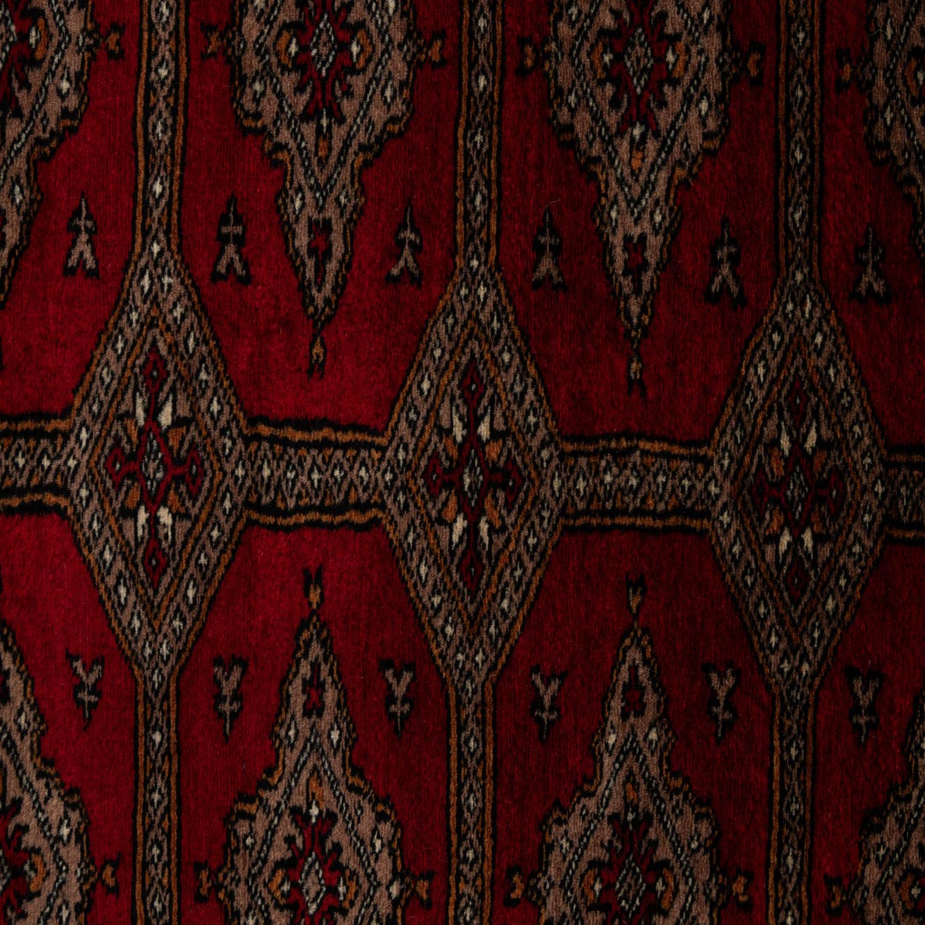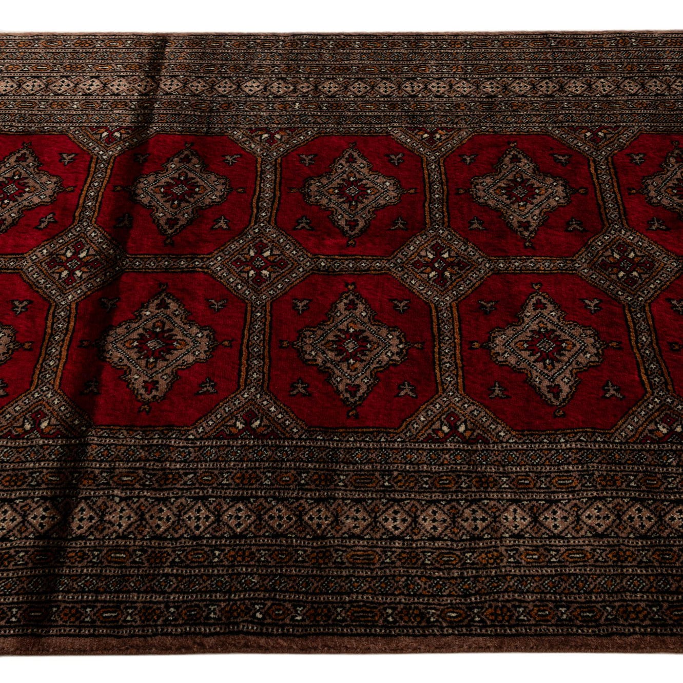 A rich red field anchors a classic Bokhara layout of stacked octagonal guls, each filled with ivory and black medallions and fine brown detailing that gives every motif clear definition. Narrow, intricately patterned borders in brown, black and ivory frame the field, while ivory fringe finishes the ends for a traditional look. Hand knotted of 100% wool, the surface has a dense, low-profile pile that feels firm but pleasantly soft underfoot, with enough texture to catch light and emphasize the pattern.