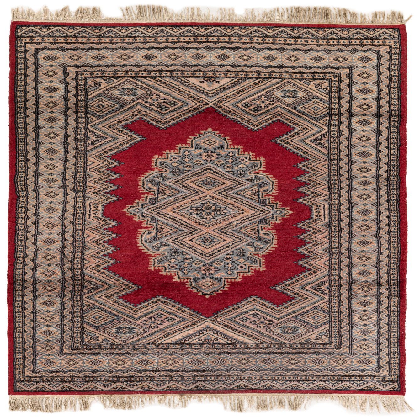 A 4x6 rectangular red wool rug with a traditional tribal medallion pattern in black, grey, and beige.