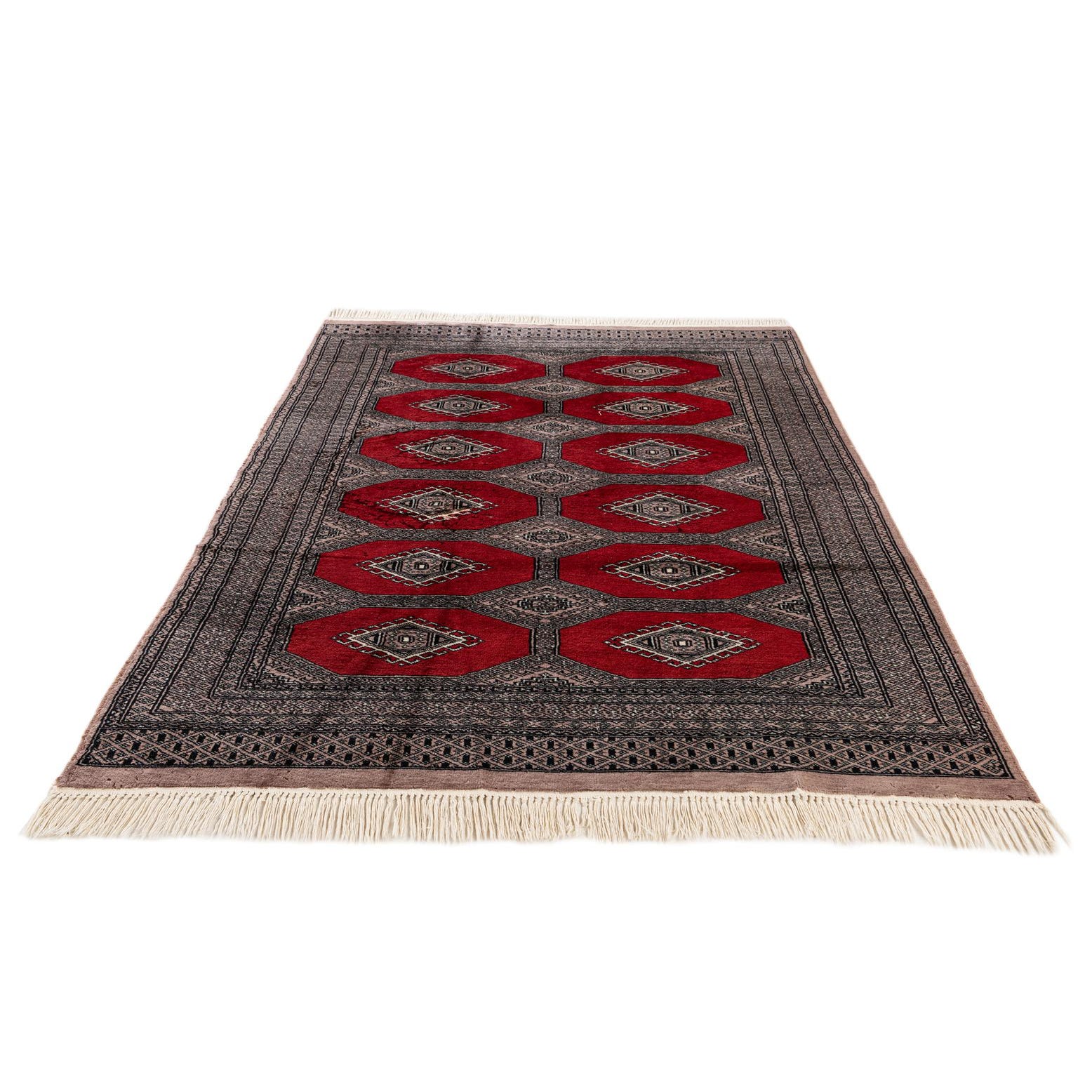 A 4x6 rectangular Bokhara rug featuring a traditional red and black tribal pattern with a thin pile and fringe.