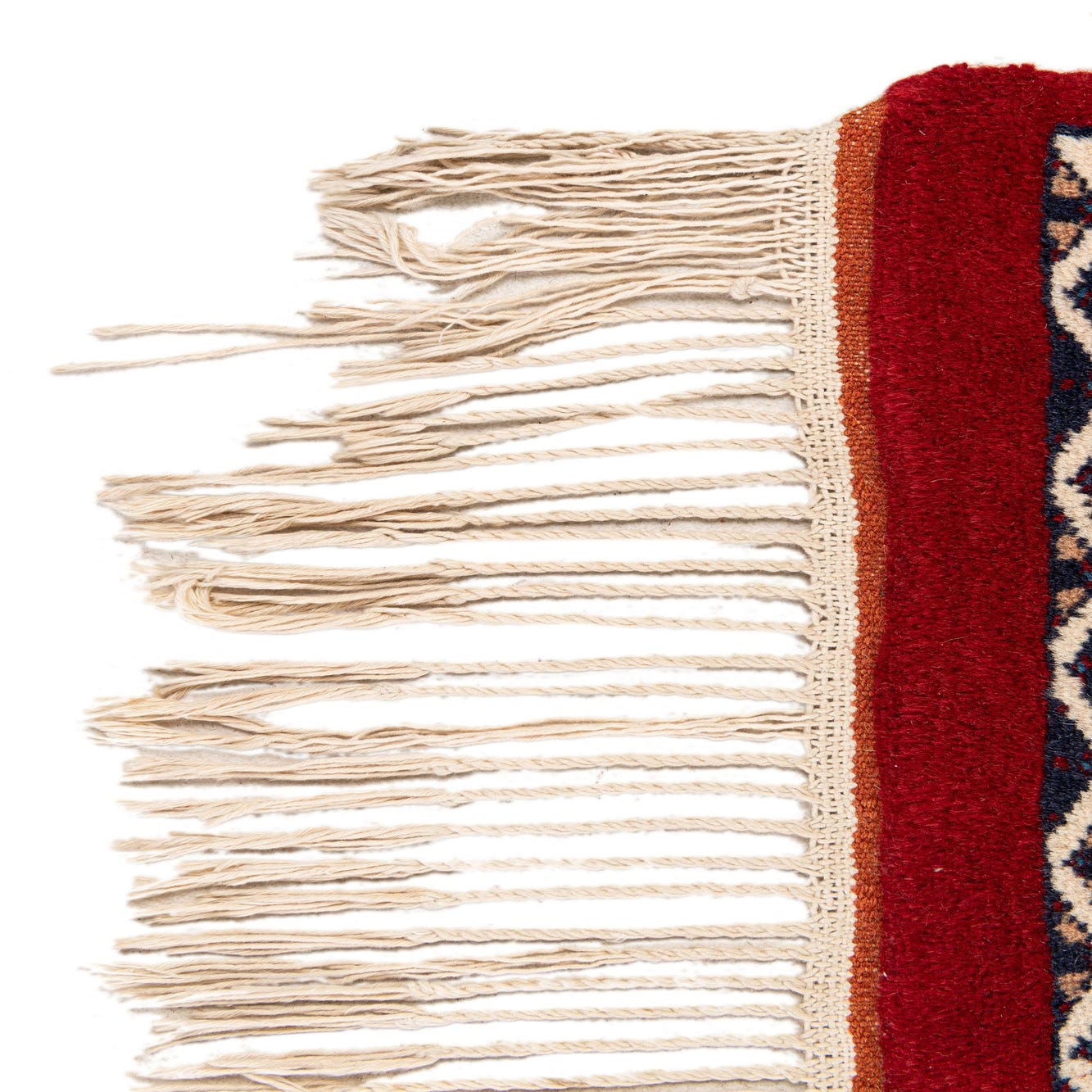 Hand-knotted in 100% wool, this rug brings a warm red background alive with rows of tightly arranged geometric medallions and vertical lattice motifs in navy blue and ivory. Multiple narrow borders with small diamond and seed-like patterns frame the central field, while natural ivory fringe finishes each end. The pile is densely knotted and sheared to a low-to-medium profile, giving a smooth, slightly lustrous surface that feels substantial underfoot without being plush.