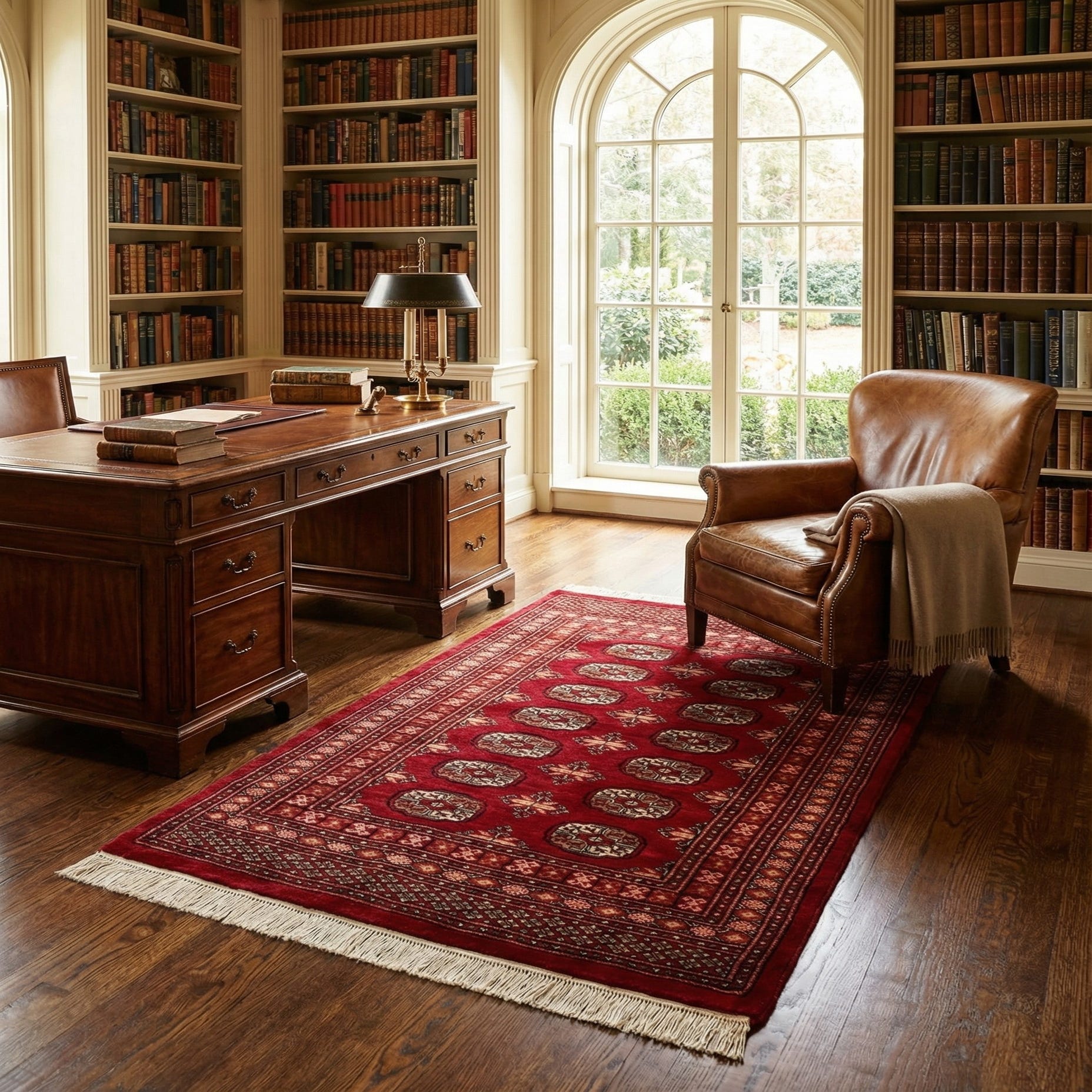 A 4x6 rectangular Bokhara Torkaman rug featuring a rich red field with traditional Persian medallions and intricate borders, handmade from wool.
