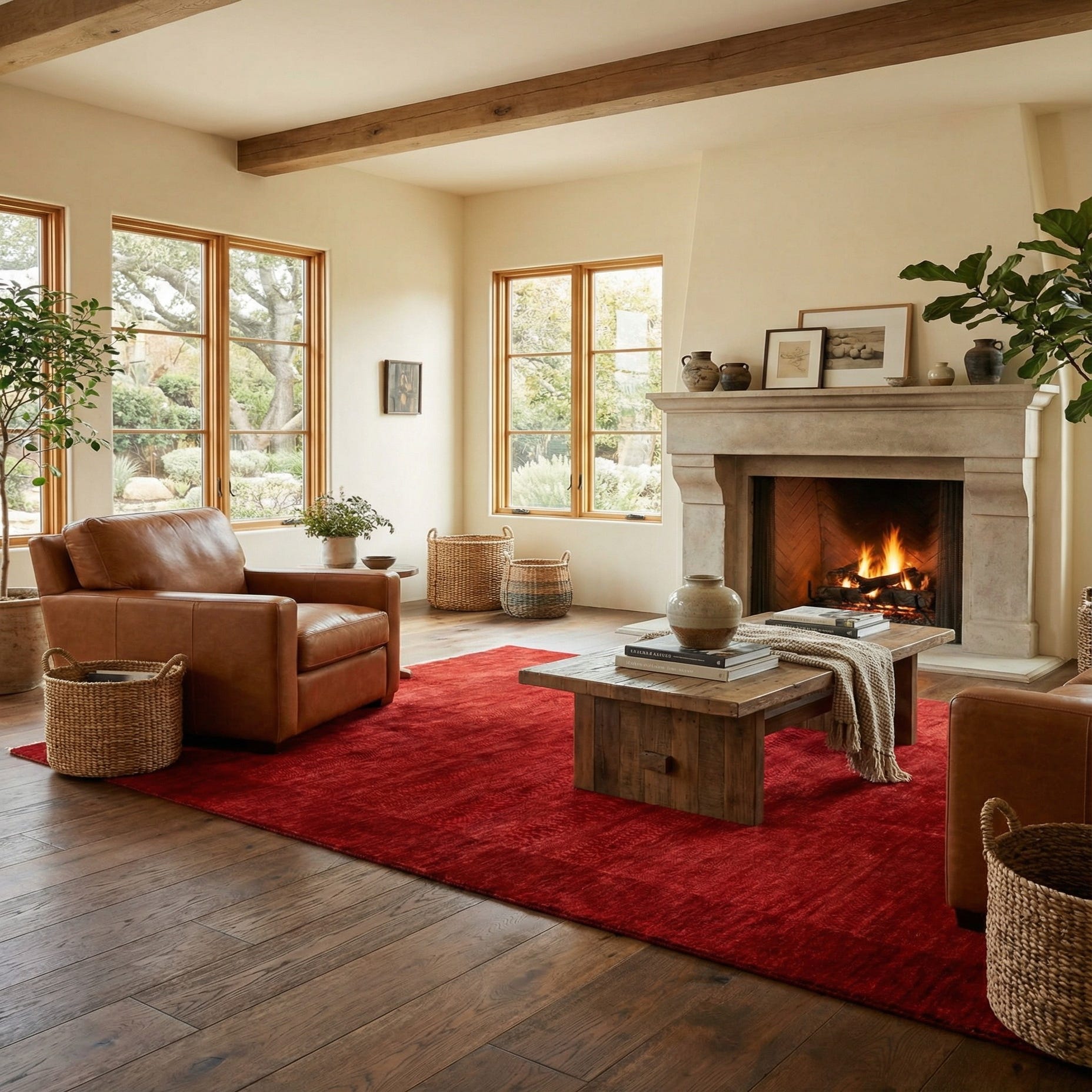 Primary color is Red. Colors in this rug include: Red, Orange.