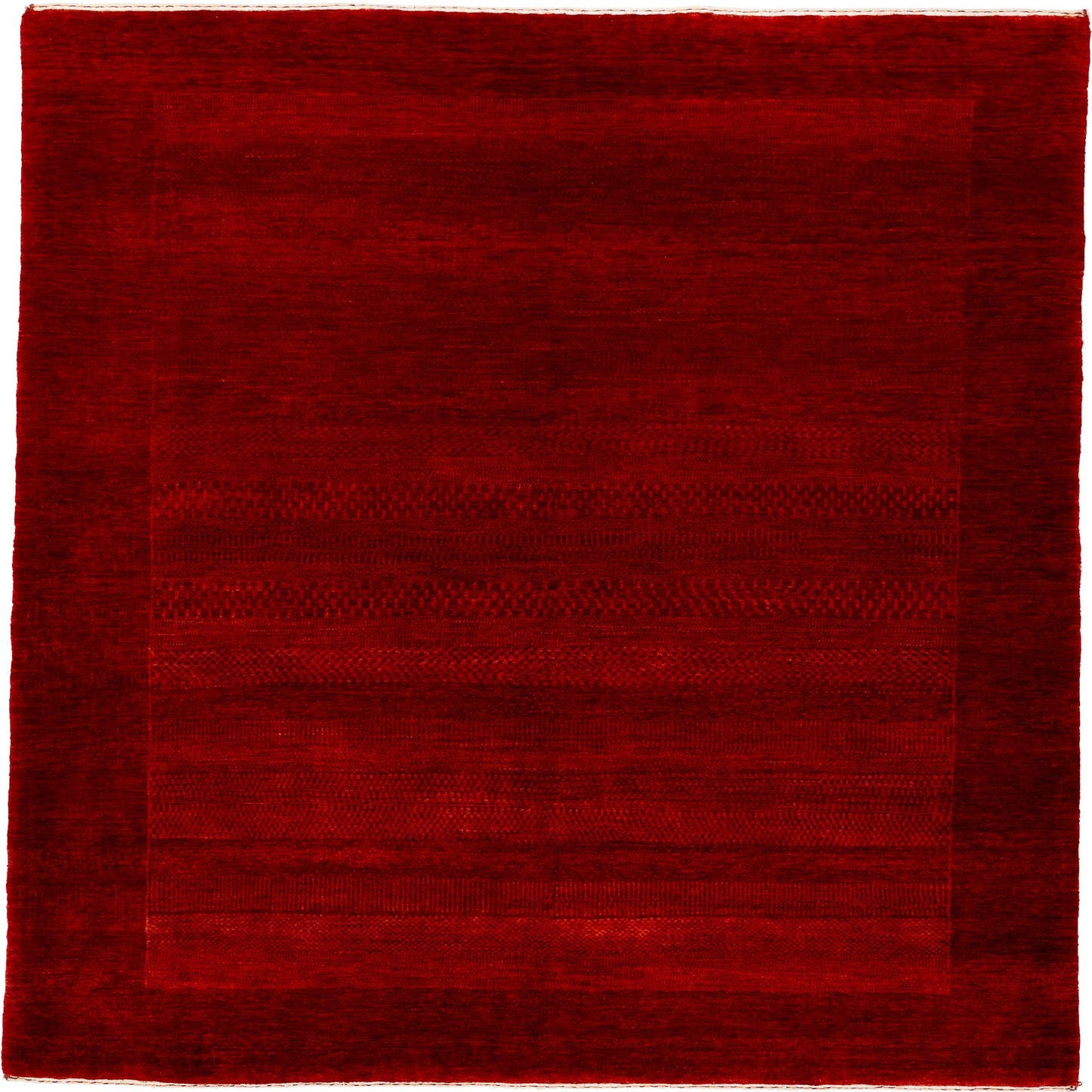 A 4x6 rectangular Gabbeh rug in deep red, featuring a subtle abstract pattern of horizontal textured bands.