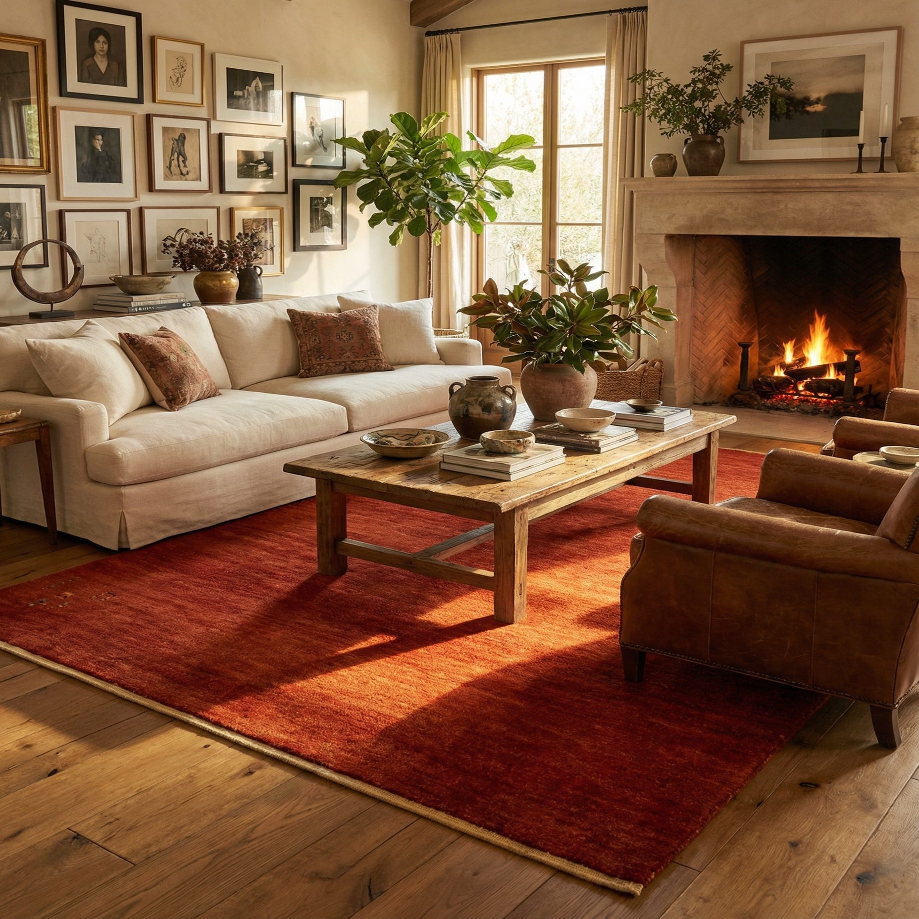 Primary color is Red. Colors in this rug include: Red, Red, Orange.