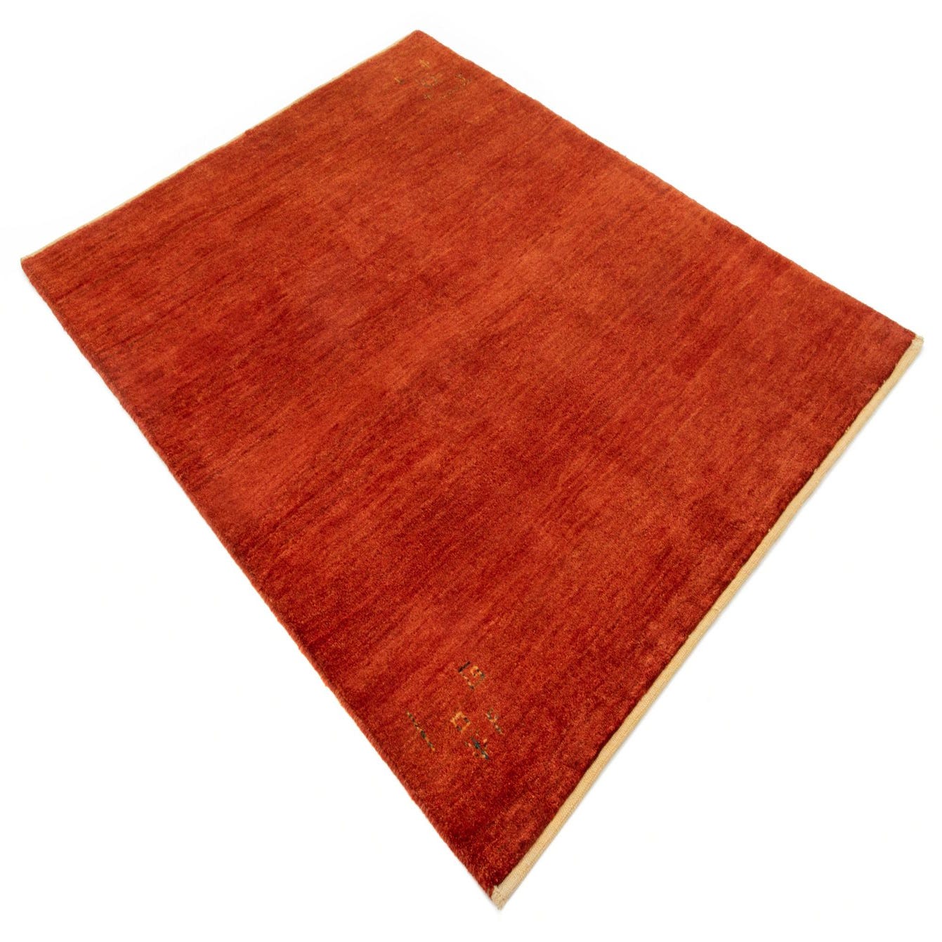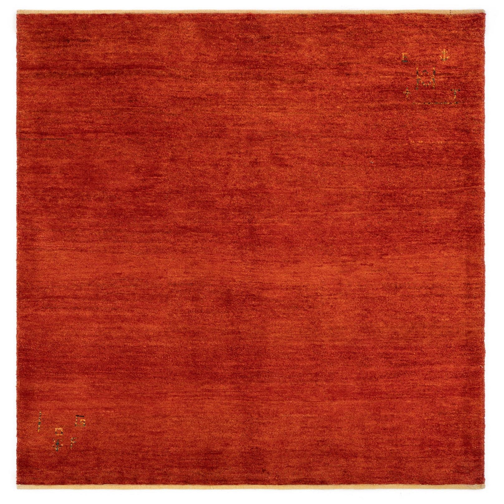 A 4x6 rectangular Gabbeh Shouli rug in rich red wool with subtle, colorful abstract accents in two corners.